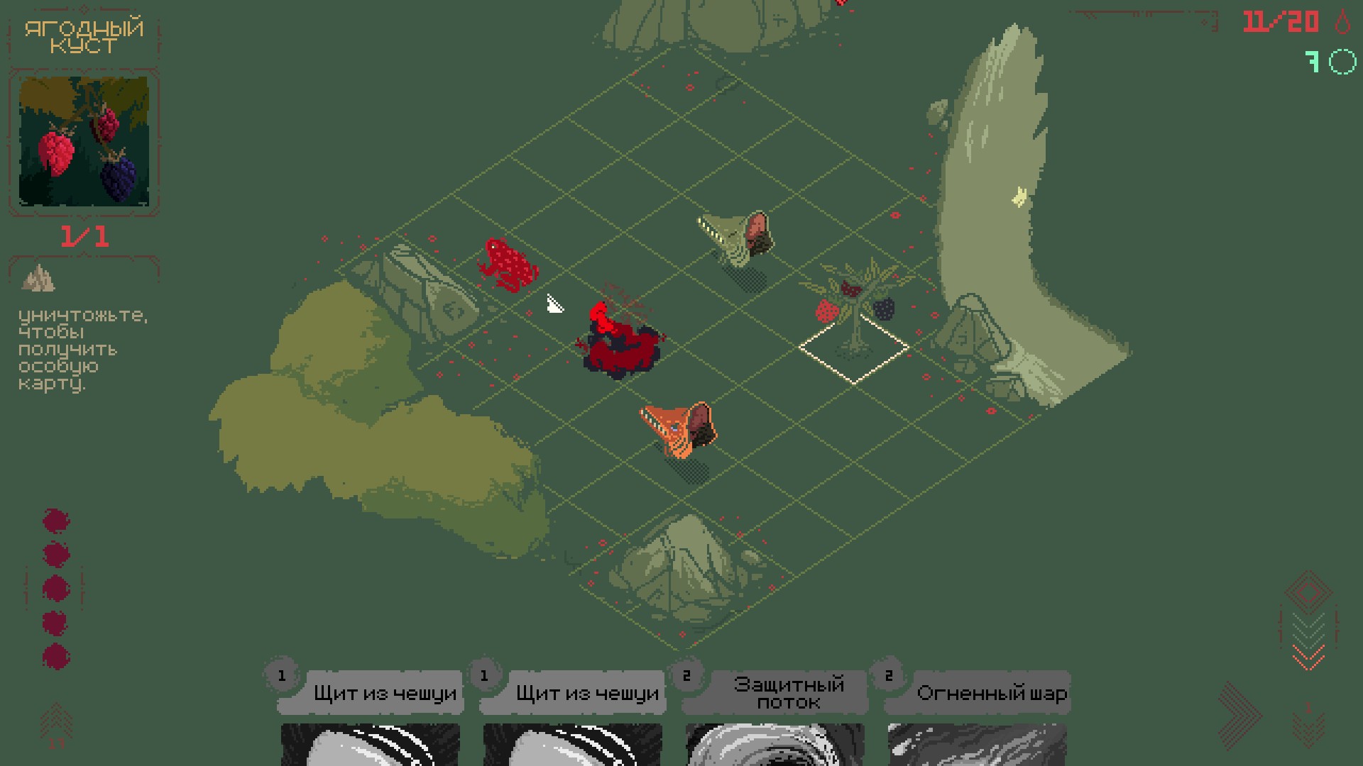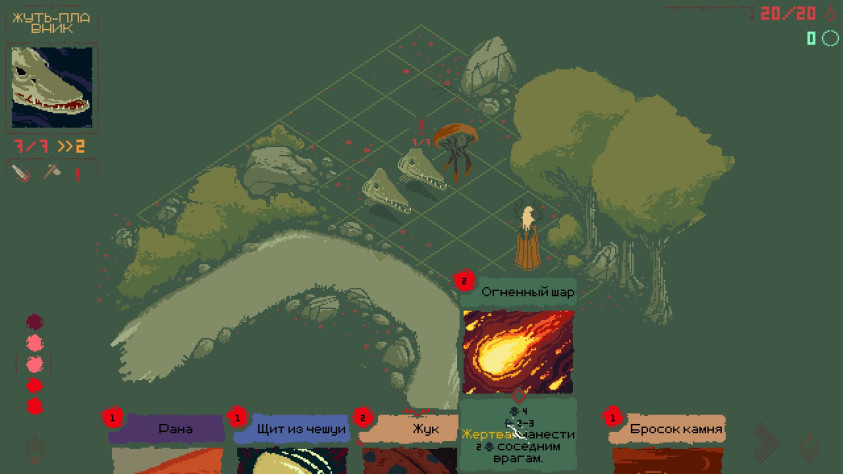 Сами сражения непохожи на то, что мы видели в Slay the Spire и Black Book. Тут есть, конечно, черты, свойственные ККИ, включая лимит маны и принципы работы многих карт. Но при этом перед нами полноценная пошаговая тактика в духе Into the Beach, где важно грамотно перемещать и располагать бойцов, а также отталкивать/сталкивать врагов как друг с другом, так и с окружением.