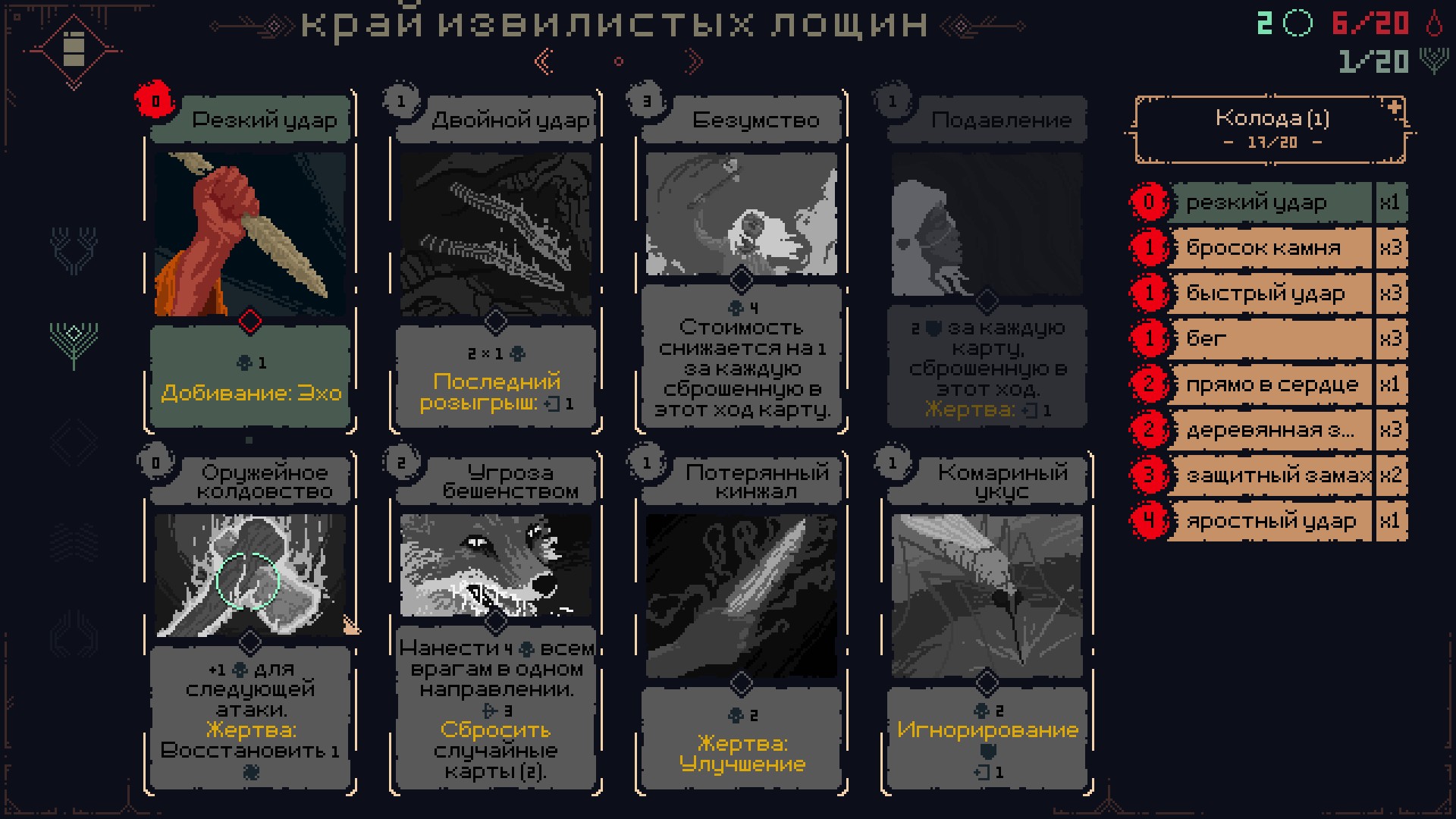 Возвращаться хотелось как раз благодаря тому, насколько тут сложные и классные сражения и как интересно подбирать колоды под разных врагов и регионы. Да, в Death Howl нет колод разных классов или школ с уникальными картами. Аналогом служат всевозможные регионы: где-то, например, делают ставку на эффекты от сброса карт, где-то — на удары в спину или на заморозку и накопление брони.