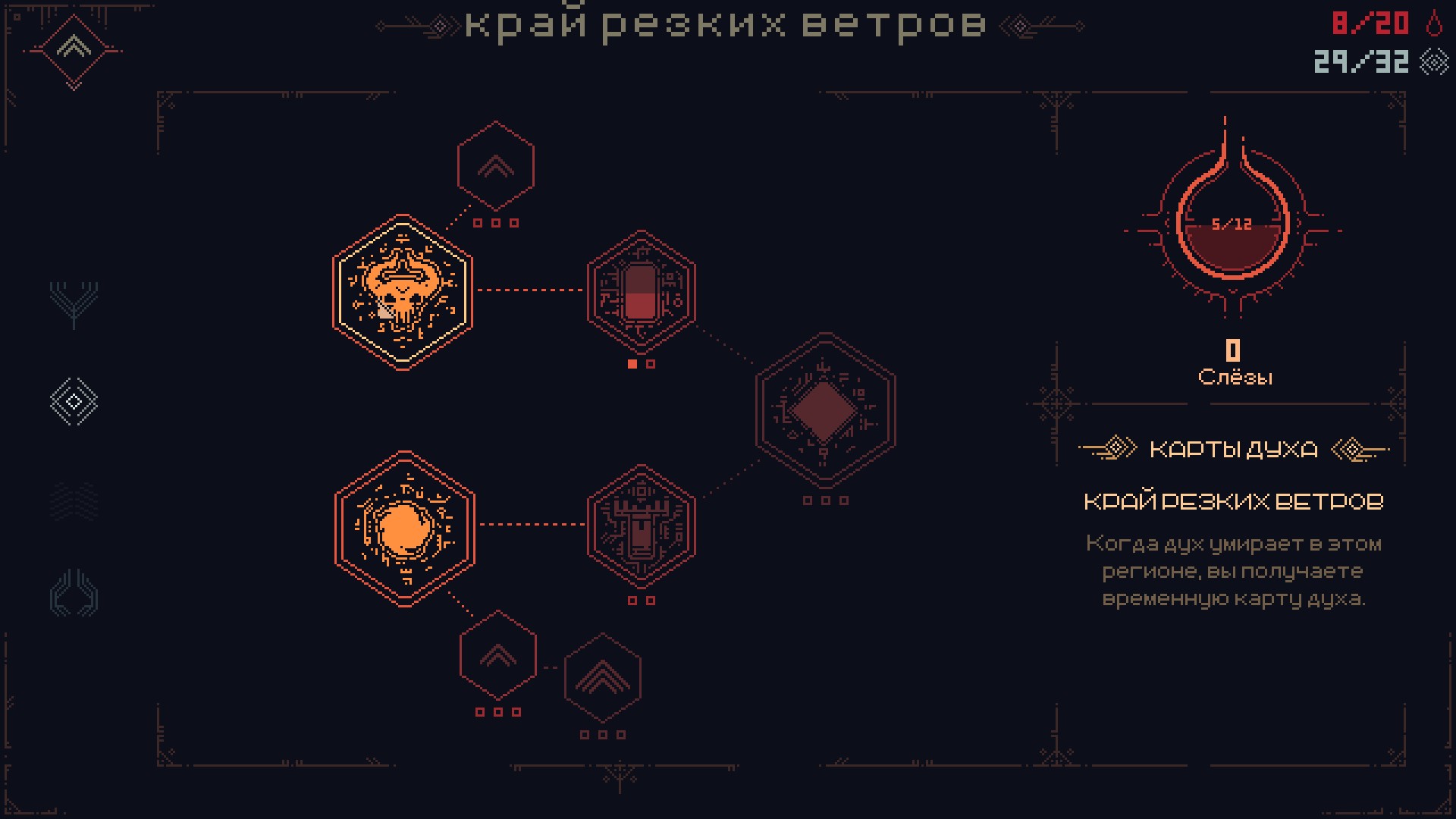 Какие ещё элементы соулслайков тут есть? Ну, в качестве костров выступают святилища, где можно восстановить здоровье (враги, понятно, снова появятся на том же месте в тот же час). А основной валютой для прокачки персонажа и создания новых карт служат души поверженных противников. И мы сами решаем, пустить их на крафт или донести до святилища, где души можно копить и трансформировать в слёзы — очки умений, и про их количество действительно можно сказать, что это слёзы какие-то. Ну и в принципе здесь сложные сражения: многие приходится переигрывать множество раз — тем более с боссами.