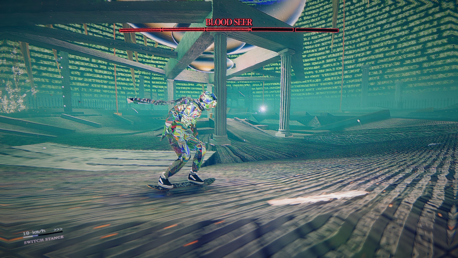 Однако это не значит, что ездить скучно. В Skate Story чередуются три типа геймплея: покатушки на открытых локациях, линейные заезды с препятствиями и сражения с боссами. Больше всего времени тратишь на первый тип — именно на просторных площадках происходят основные сюжетные события. За участие во второстепенных развлечениях получаешь души, которые можно обменивать в сувенирных лавках на новые колёса, раскраски для скейтборда и прочую «косметику». Так что прыгаешь над зловонными люками, ревёртом срезаешь душецветы, вращением — длинные побеги, пробивающие асфальт… А также участвуешь в испытаниях, ищешь коллекционные предметы (включая стикеры для доски) и общаешься со странными персонажами, например со страдающими скелетами.