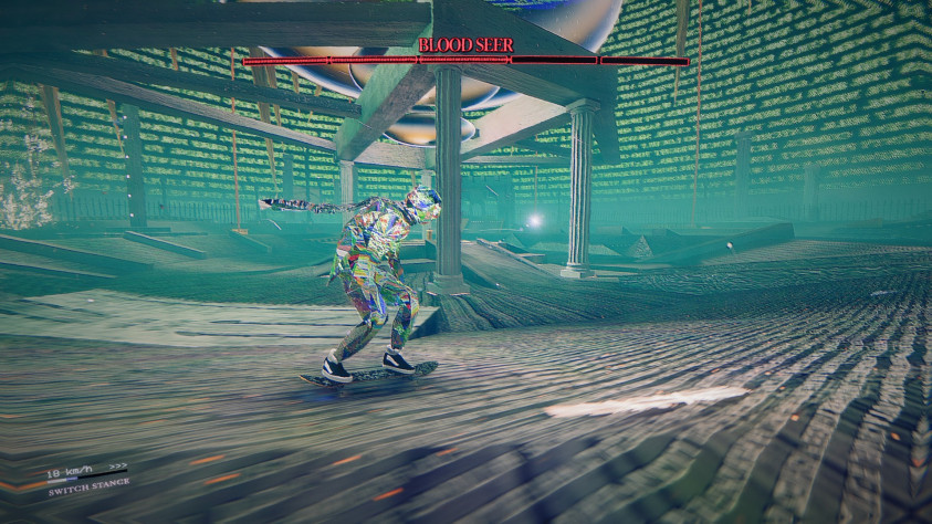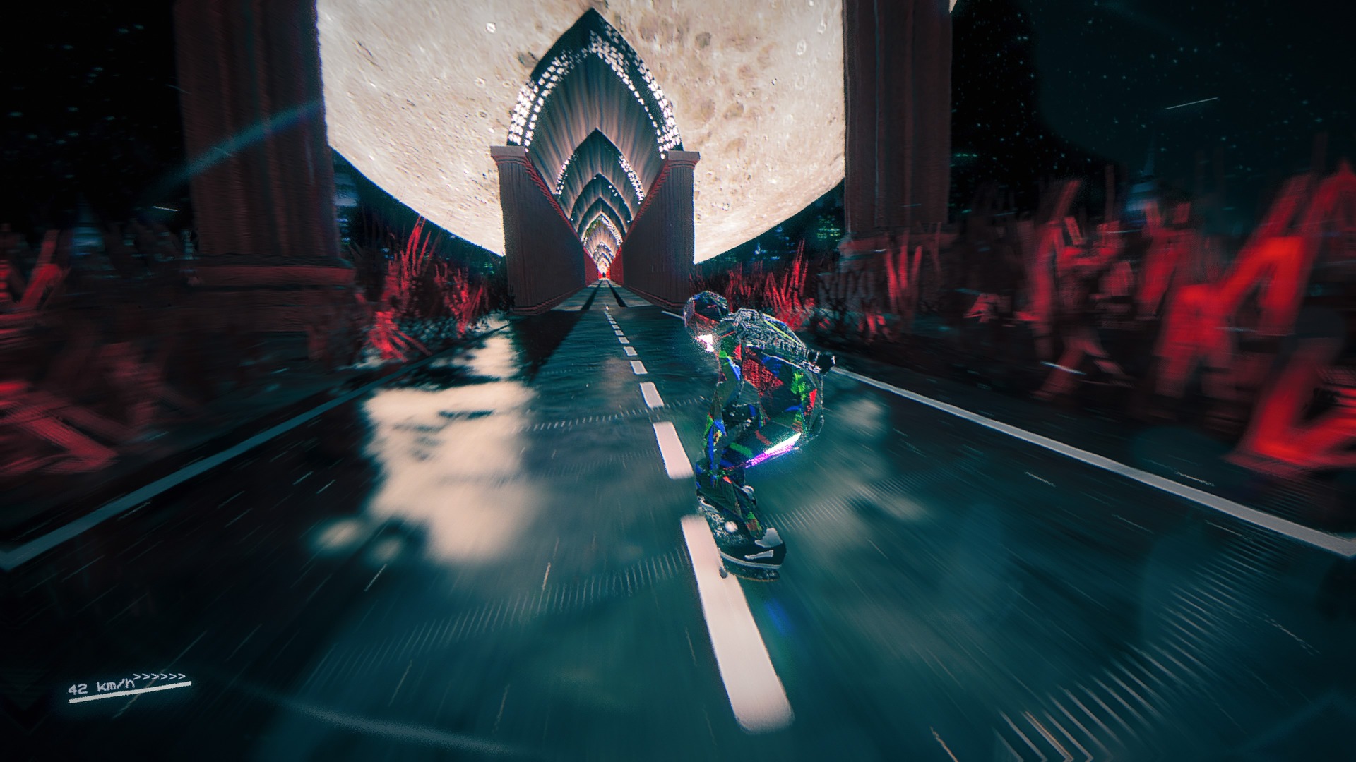 В линейных заездах геймплей немного меняется — там уже не занимаешься чем хочешь, а гоняешь от одного портала к другому, перепрыгивая через колючие кусты, разбивая барьеры и разнося на высокой скорости висящие в воздухе глаза. Сложными такие эпизоды не назовёшь — таймеров нет, поделены эти заезды на несколько участков, и в случае падения игрока просто переносят в начало сегмента. Но эти моменты оказываются одними из самых ярких в игре благодаря музыке — коллектив Blood Cultures написал настолько великолепный саундтрек, что после пары уровней идёшь искать последний альбом и слушаешь его день за днём. Это то ли электропоп, то ли психоделик-поп — что бы это ни было, звучит каждый трек сочно и атмосферно.