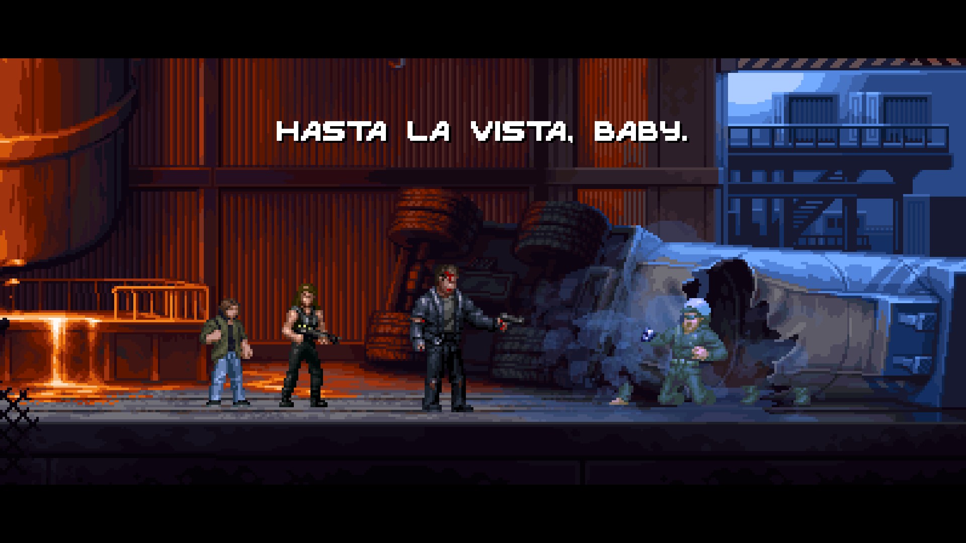 Проще всего было бы сказать, что Terminator 2D: No Fate — это любовное письмо к играм и фильмам прошлого, интересное лишь фанатам. Но мне представляется другой вариант. В мрачном будущем, где Джеймс Кэмерон снял нового «Терминатора» без персонажей Арнольда Шварценеггера и Линды Хэмилтон, а Т-800 так и остался в памяти престарелым продавцом штор из «Тёмных судеб», несогласные британцы из Bitmap Bureau воссоздали технологии Skynet и отправились в прошлое. И всё ради того, чтобы создать игру, которая напомнит людям в 2025-м, какими героями были Т-800 и Сара Коннор и какие фильмы лучшие и самые каноничные во франшизе. Я поверил, вспомнил и оценил — а теперь в счастливом ностальгическом угаре пошёл за своими таблетками…