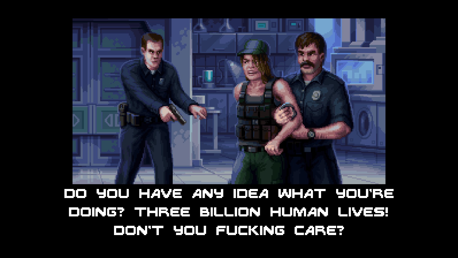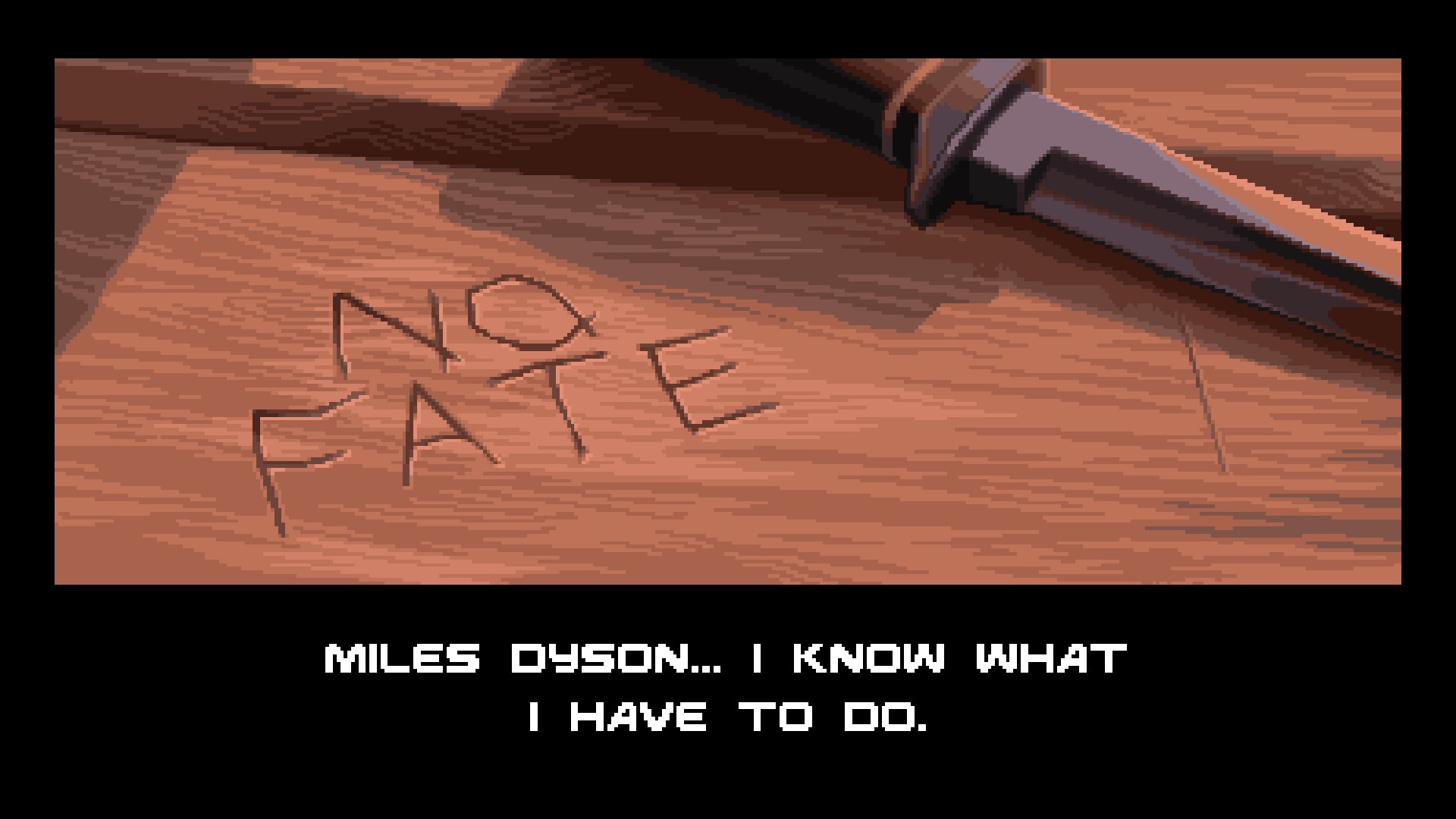 Так вот, в Terminator 2D авторы сделали ставку не только на эмоции и воспоминания, но и на возможность изменить сюжет. Нет, изменить всю эту пространственно-временную чехарду не получится, но можно своими решениями повлиять на судьбу главных героев. И это идеально укладывается в историю и концепцию «Судного дня», где одна из ключевых сцен — та, где Сара видит вырезанную ножом фразу No Fate и решает всё-таки изменить судьбу.