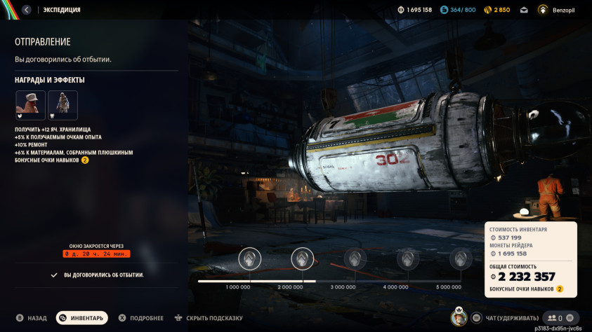 На деле же получилось так, что весь собранный лут пришлось хранить до последнего момента или продавать. Дело в том, что финальным этапом экспедиции, о котором не сообщалось изначально, оказалось накопление 5 млн монет — за каждый миллион обещали бонусное перманентное очко навыков. Приз, конечно, не ахти, но и лишать себя подарков было бы странно — с этими очками сразу можешь слегка увеличивать запас выносливости в каждом сезоне.