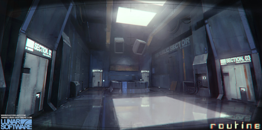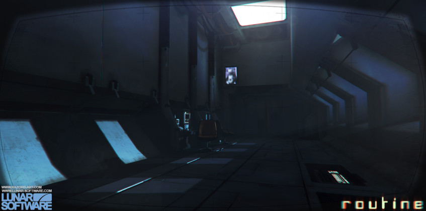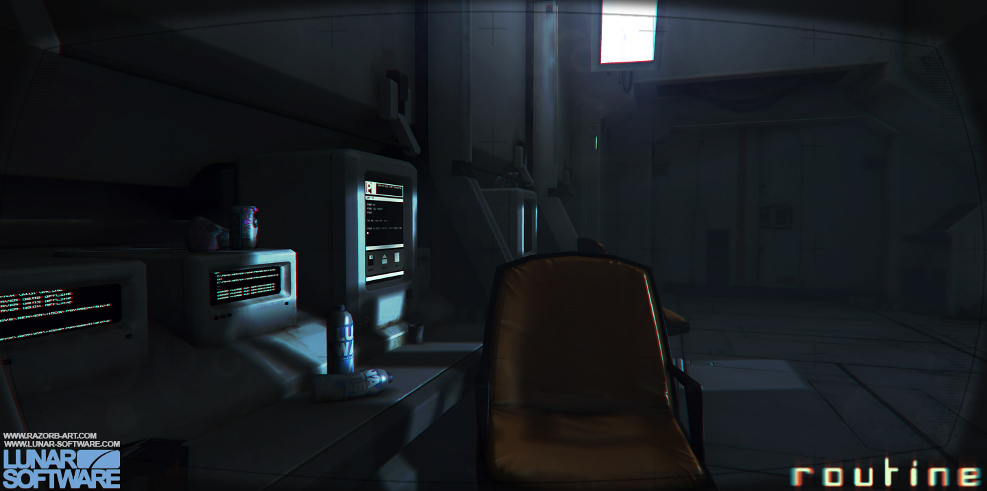 В финальной версии Routine можно приближать ИПК к лицу персонажа и рассматривать устройство, вручную включать и отключать модули для экономии заряда и даже заменять компоненты, чтобы получать доступ к новым возможностям. ИПК необходим для взаимодействия с компьютерами, активации панелей, изучения стен и так далее — на нём даже фонарик есть. А ещё его можно использовать как шокер, чтобы отбиваться от взбесившихся роботов. Разработчики называют ИПК главным героем игры, но в 2018 году он был далеко не таким многофункциональным — больший упор делался на окружение, которое на UE4 получалось по-настоящему жутким. Новый движок позволял Хьюз превращать ранние наброски Фостера в мрачные, атмосферные локации, однако коллектив понимал, что без посторонней помощи не обойтись.