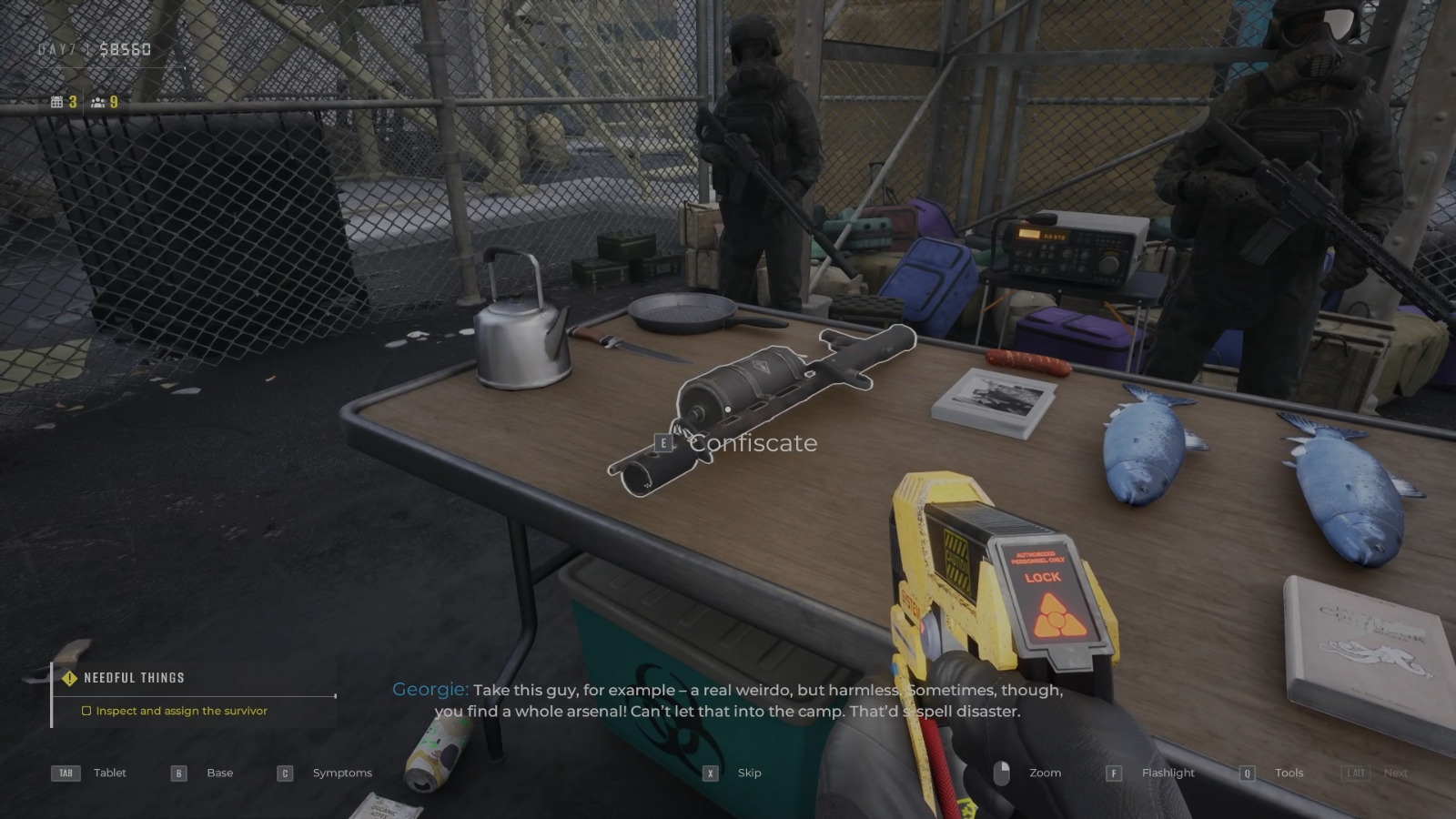 С этого дня также появятся выжившие с рюкзаками, и вы сможете проверять их содержимое. Когда выживший приходит с рюкзаком, он кладёт его сбоку, около стола. Вы можете проверить содержимое на наличие запрещённых предметов. Оружие подлежит конфискации, а вот части зомби указывают на то, что выживший уже заражён, то есть в таком случае человека следует отправить на ликвидацию.
