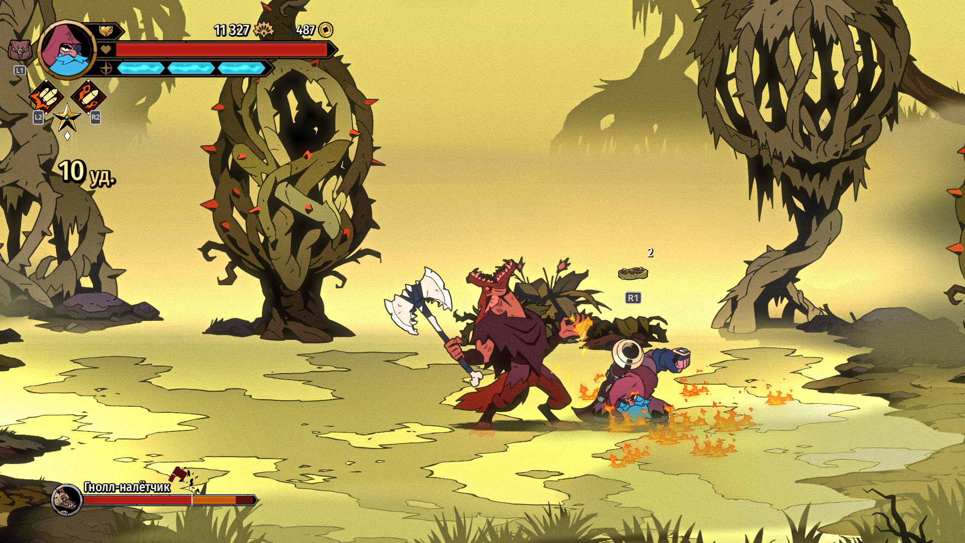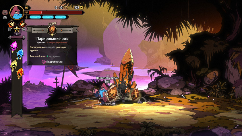 Нередко за зачистку арен дают не «пассивки», а валюту, которая в забеге никак не используется, зато нужна на базе. За неё у Древа Души покупаешь перманентные апгрейды, каждый из которых кажется полезным. Сначала это просто увеличение стартового здоровья, шанса критического удара и урона от метательного оружия. Потом повышаются шанс выпадения редких аксессуаров, количество метательного оружия и мощность атак с воздуха. А в какой-то момент вы откроете бонус, с которым в случае смерти персонаж сразу воскреснет с небольшим запасом здоровья, попутно сбив с ног всех противников. Если повезёт и удачно воспользуетесь таким шансом, то потом сможете восстановить жизни с помощью еды, иногда выпадающей из ящиков и врагов.