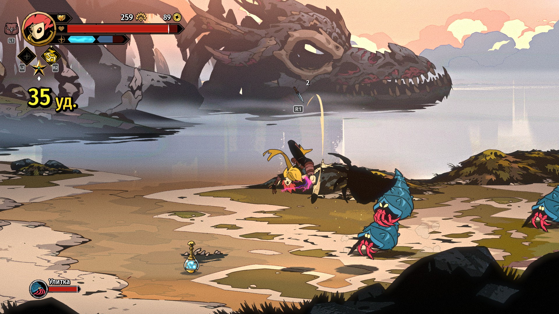 Персонажа делаешь сильнее и другими способами. Нанимаешь ИИ-напарника в местах, где он обычно тусуется, и надеешься, что он доживёт до встречи с боссом. Покупаешь за золото, выпадающее из противников, аксессуары у торговцев. Например, есть талисман, увеличивающий показатель удачи, — он повышает шанс выпадения полезных предметов. Стараешься чаще вспоминать об арканах и метательном оружии — всякие топоры и кинжалы служат расходниками и лежат чуть ли не на каждом углу. А при победах над боссами принимаешь непростые решения, выбирая так называемые вдохновения (среди них даже встречаются новые приёмы, и довольно часто).