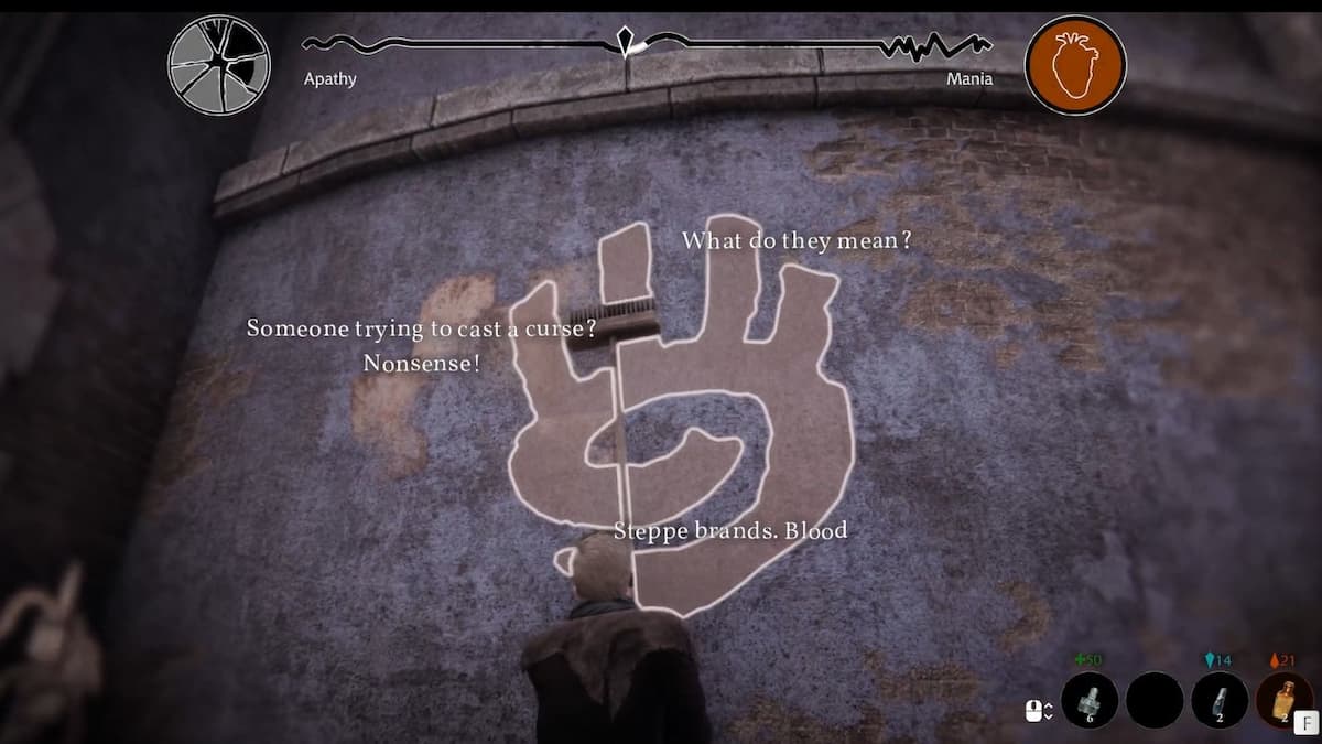 Утром при выходе из Омута обратите внимание на боковую стену здания с крупным символом, окружённым венками. Чтобы понять его значение, нужна помощь Артемия Бураха из больницы — возможность выполнения квеста зависит от того, жив ли он, признан ли виновным или невиновным на суде и принят ли в помощники.