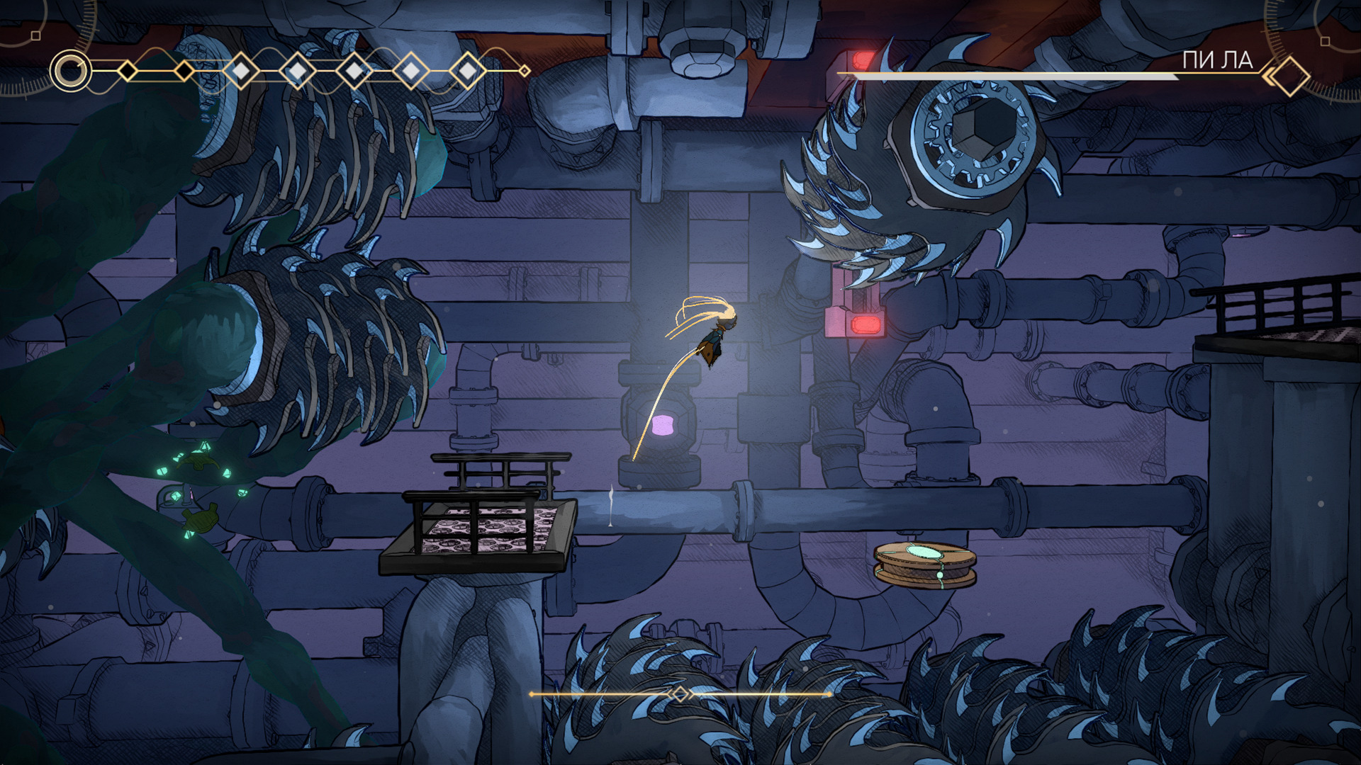 Но даже без этого боссов удастся победить, если овладеть искусством парирования. Это не трудно, поскольку оппоненты чаще всего готовятся к атакам, а после двух или трёх попыток запоминаешь их приёмы и по замахам можешь определить, что делать в следующую секунду. В то же время бьют злодеи больно, да и набор их умений меняется при потере половины здоровья. Разработчикам MIO удалось достичь идеального баланса — боссов далеко не всегда побеждаешь с первой попытки, но и застревать с ними на полчаса в одной комнате приходится редко. Плюс все они уникальны, ведут себя совершенно по-разному, вынуждают менять тактику и не показались мне клонами оппонентов из других метроидваний.
