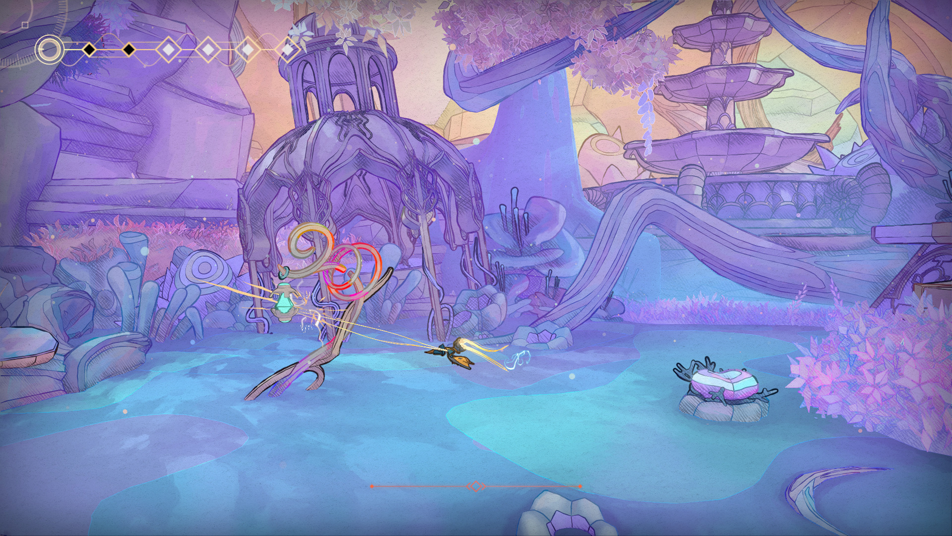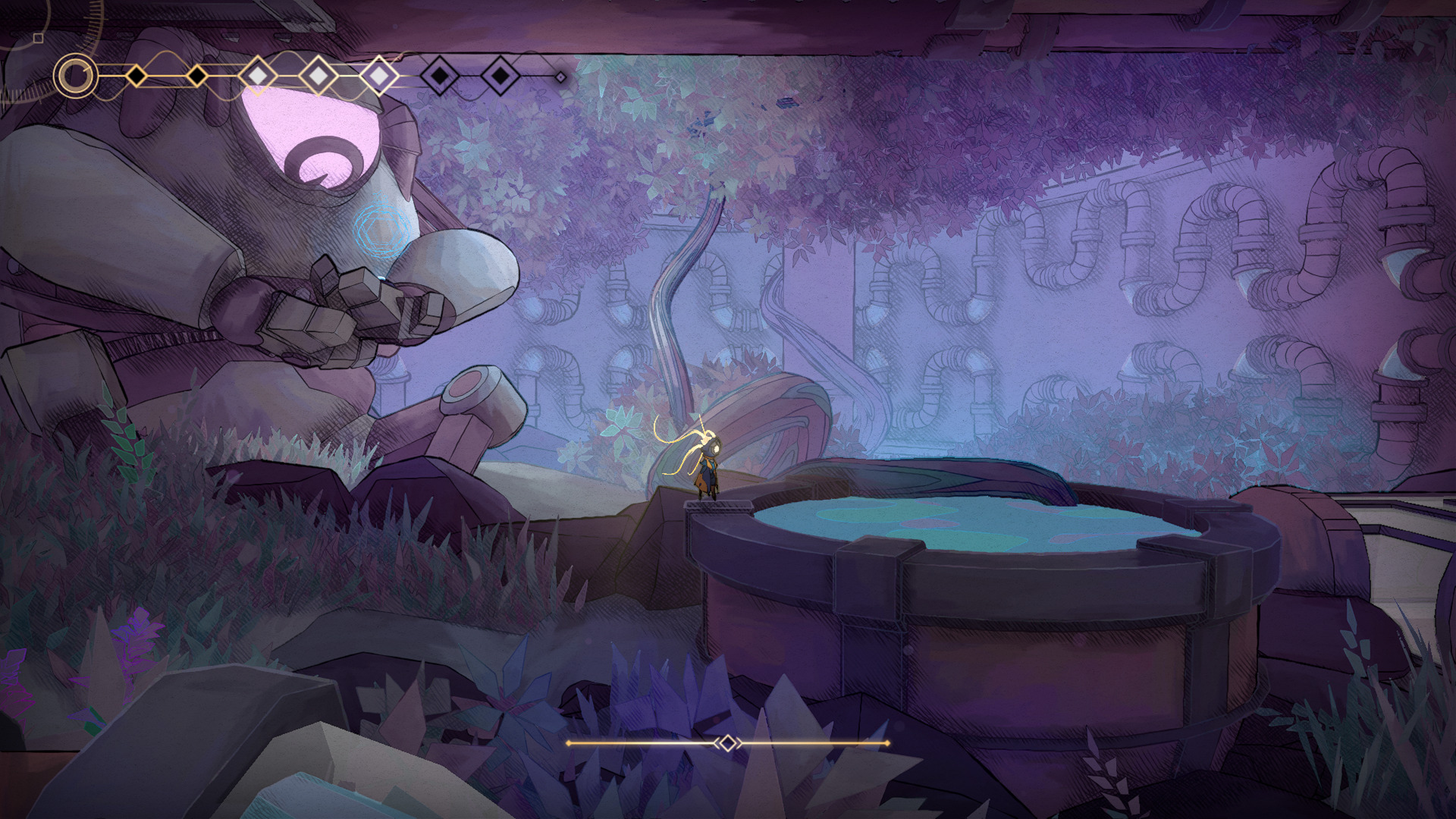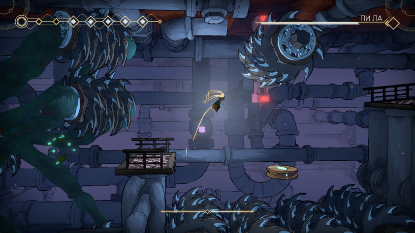 Конечно, в MIO не обошлось без раздражающих сегментов — некоторые платформенные эпизоды требуют недюжинной ловкости рук, из-за чего мой большой палец иногда уставал давить на крестовину. То спасаешься от надвигающейся опасности, то чередуешь отскоки от противников с использованием шпильки, причём по нескольку раз подряд, пытаясь не рухнуть на красную траву, которая поглощает персонажа и переносит к ближайшей платформе. Воды героиня тоже боится, равно как и лазеров, и есть локации, в которых твоему присутствию явно не рады, судя по количеству преград.