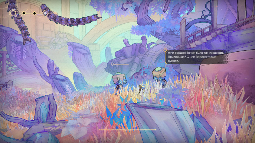 Даже когда способностей открыто не так много, исследовать мир увлекательно. Натыкаешься на персонажей, которые говорят загадками или попали в беду и после спасения отправятся в другое место. Забираешь у погибших юнитов фрагменты данных, представляющие собой записки, которые раскрывают подробности о «Ковчеге» и мире за его пределами. Для этого же нужны записки странников, артефакты и прочие «собирашки». Если повезёт, то найдёшь защитный компонент — соединяешь четыре штуки и повышаешь максимальное здоровье. Или подберёшь расширения, которые увеличивают число ячеек для модификаций.