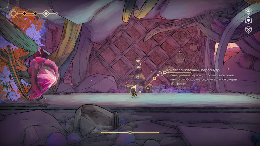 В обзоре Silksong я жаловался, что секретные комнаты часто приводят к посредственным наградам — по крайней мере, если говорить об «очевидных» секретах, а не о тех, которые без гайда трудно найти. В MIO такое тоже бывает, но заметно реже — в худшем случае получишь валюту, нужную для покупки модификаторов у торговца. Она сразу будет кристаллизованной, то есть не пропадёт в случае смерти, а обычную валюту, выпадающую из поверженных врагов, можно кристаллизовать в специальном устройстве. Желательно это делать при первой возможности, поскольку в противном случае перламутр (так тут называют деньги) теряется безвозвратно — на месте смерти не остаётся трупа, при взаимодействии с которым вернёшь нажитое.