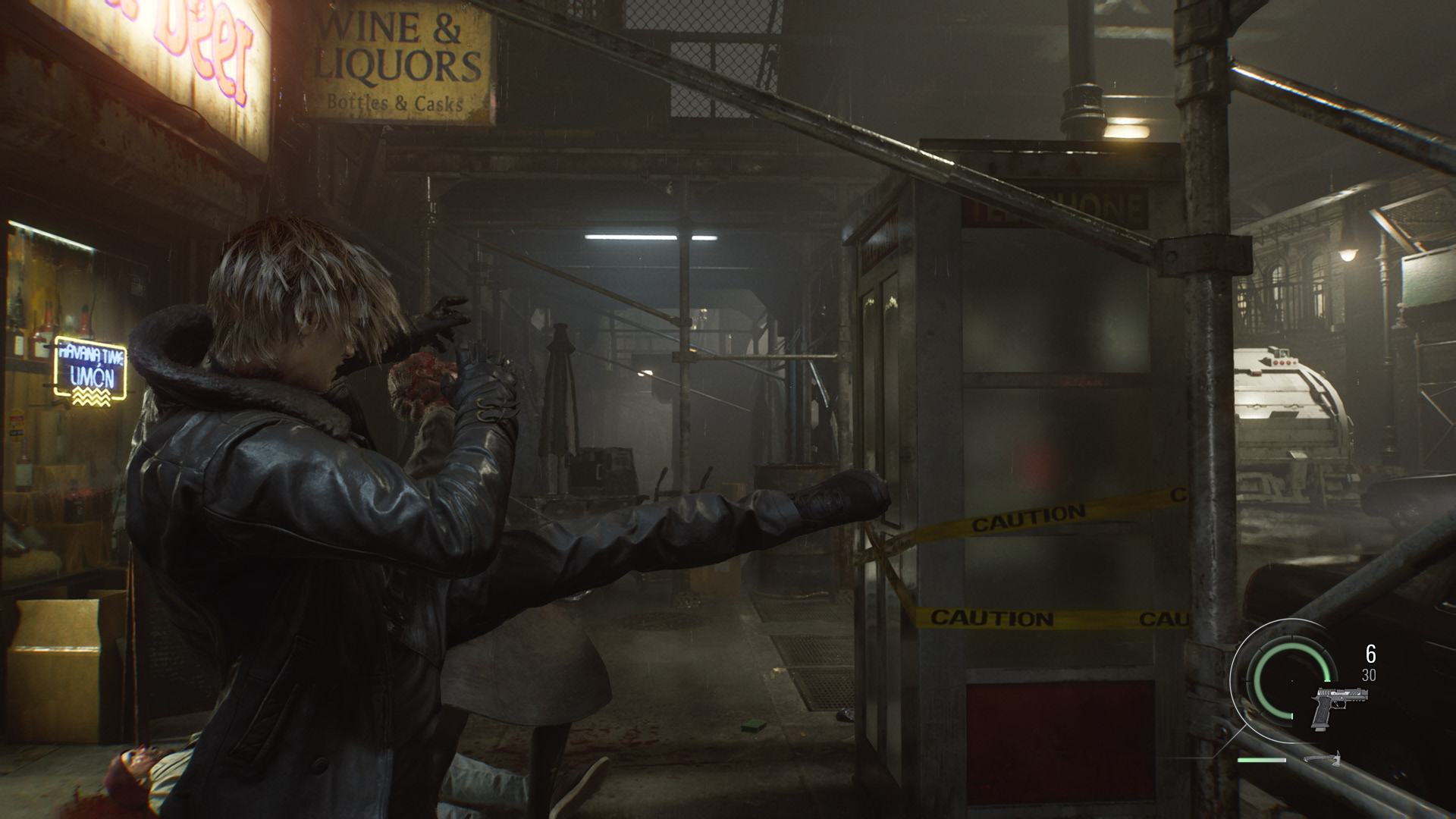 Когда зомби падёт, его топор тоже окажется на земле. Если поблизости есть враг, появится подсказка — вы сможете швырнуть оружие в противника. Добравшись до перекрёстка, вы станете свидетелем масштабной автомобильной аварии: зомби перебираются через машины, чтобы добраться до вас. Леону нужно действовать быстро — игра предложит экипировать револьвер «Реквием».