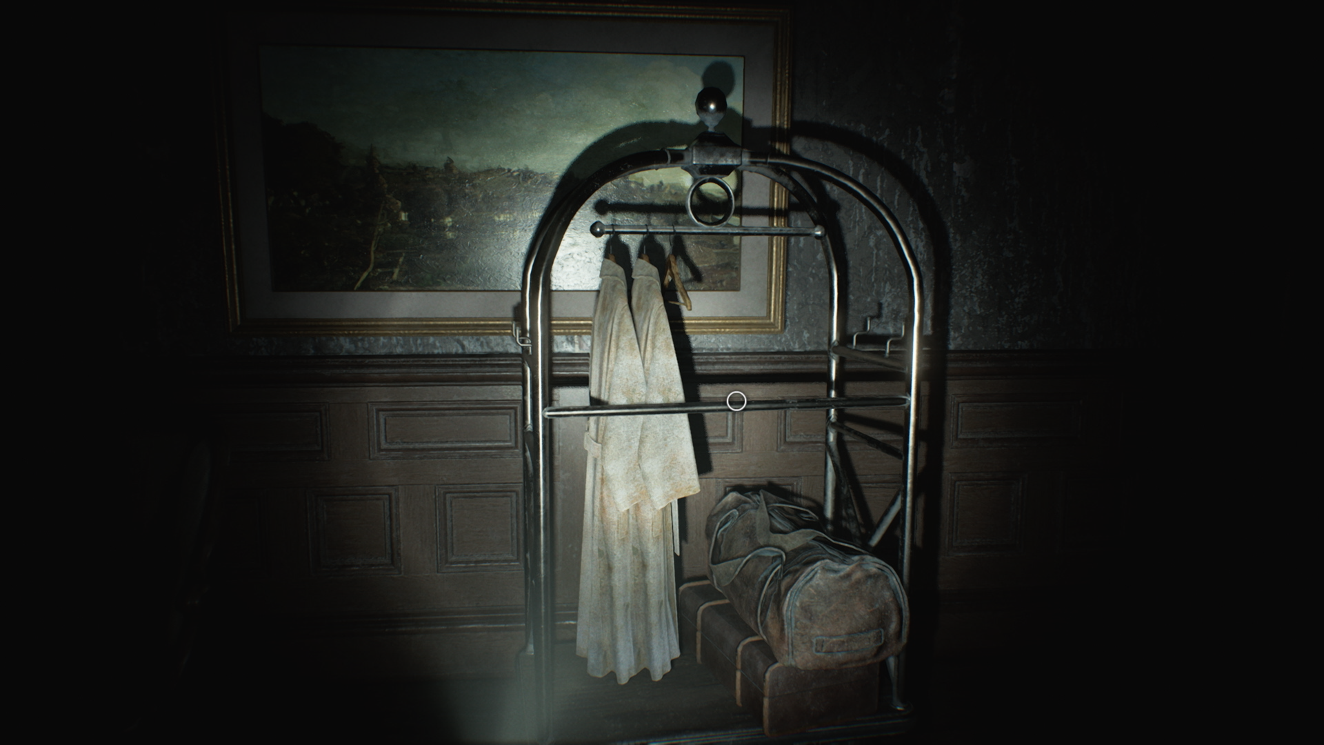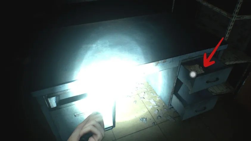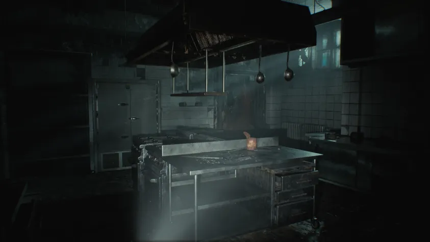 Войдите в служебный вход сбоку здания — вы окажетесь в тёмном помещении. Нажмите на клавишу G, чтобы включить фонарик, и двигайтесь дальше. Следуйте вправо — там будет красная дверь. Пройдя через неё, вы попадёте в грязную кухню отеля. Можно поднять кастрюлю в углу слева и узнать, что спрятано под ней (и тут же об этом пожалеть), открыть холодильник. Затем пройдите через дальнюю дверь. Грейс соберётся с духом и войдёт в основную часть отеля.