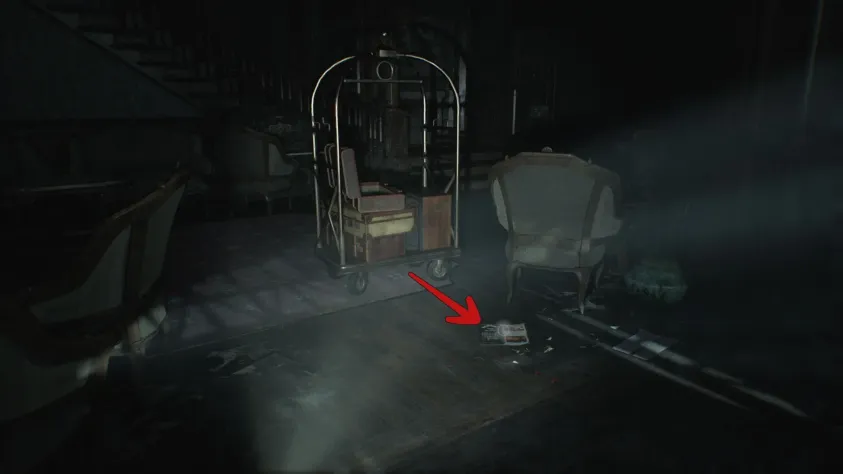 Спуститесь в лобби. Теперь вы сможете взаимодействовать с тележкой для багажа, которую Алисса задвинула перед картиной восемь лет назад. Оттолкните её и осмотрите картину — там вы найдёте спрятанное. Осмотрите заднюю часть сумки, откройте застёжку и поверните так, чтобы заглянуть внутрь. Вытащив блокнот и открыв его, вы получите дневник Алиссы (документ 5/75). Похоже, Алисса знала, что за ней следят…
