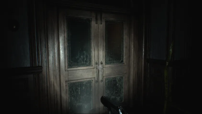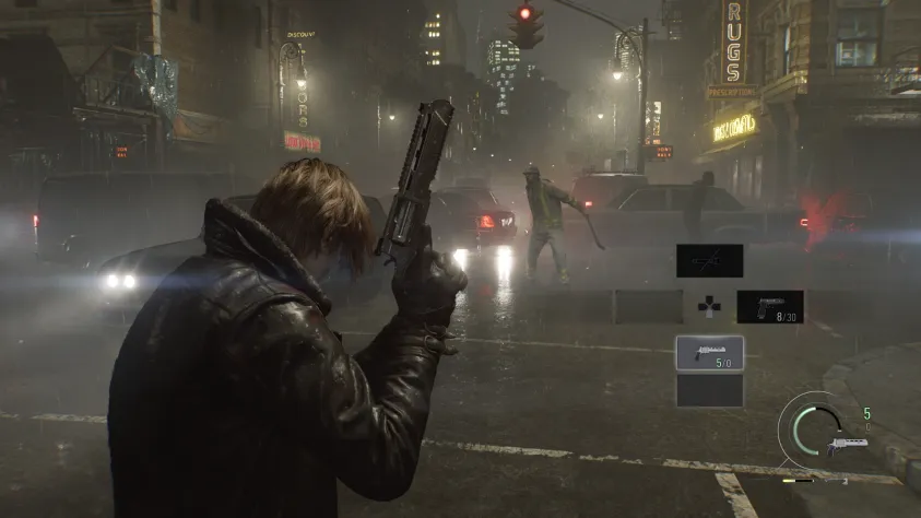 Как и в ремейках Resident Evil 2 и Resident Evil 4, стандартная камера от третьего лица у Леона предполагает прицеливание «через плечо»: удерживайте ПКМ для прицеливания и щёлкайте ЛКМ, чтобы стрелять. Начальный арсенал Леона состоит из пистолета «Крокодильи слёзы» (с солидным запасом патронов) и мощного штурмового револьвера «Реквием». Используйте пистолет, чтобы несколько раз попасть зомби в голову, пока женщина не успела приблизиться.