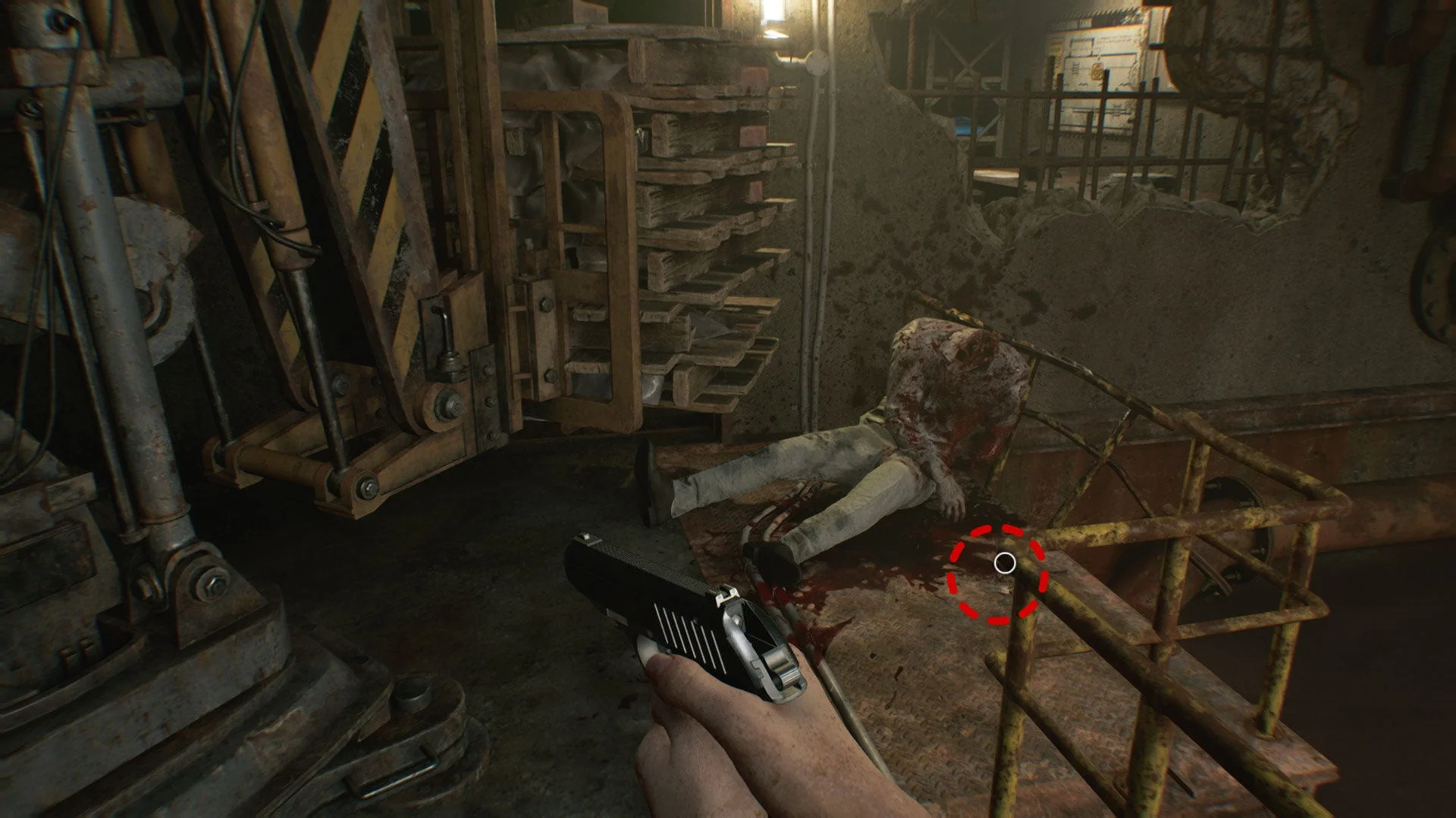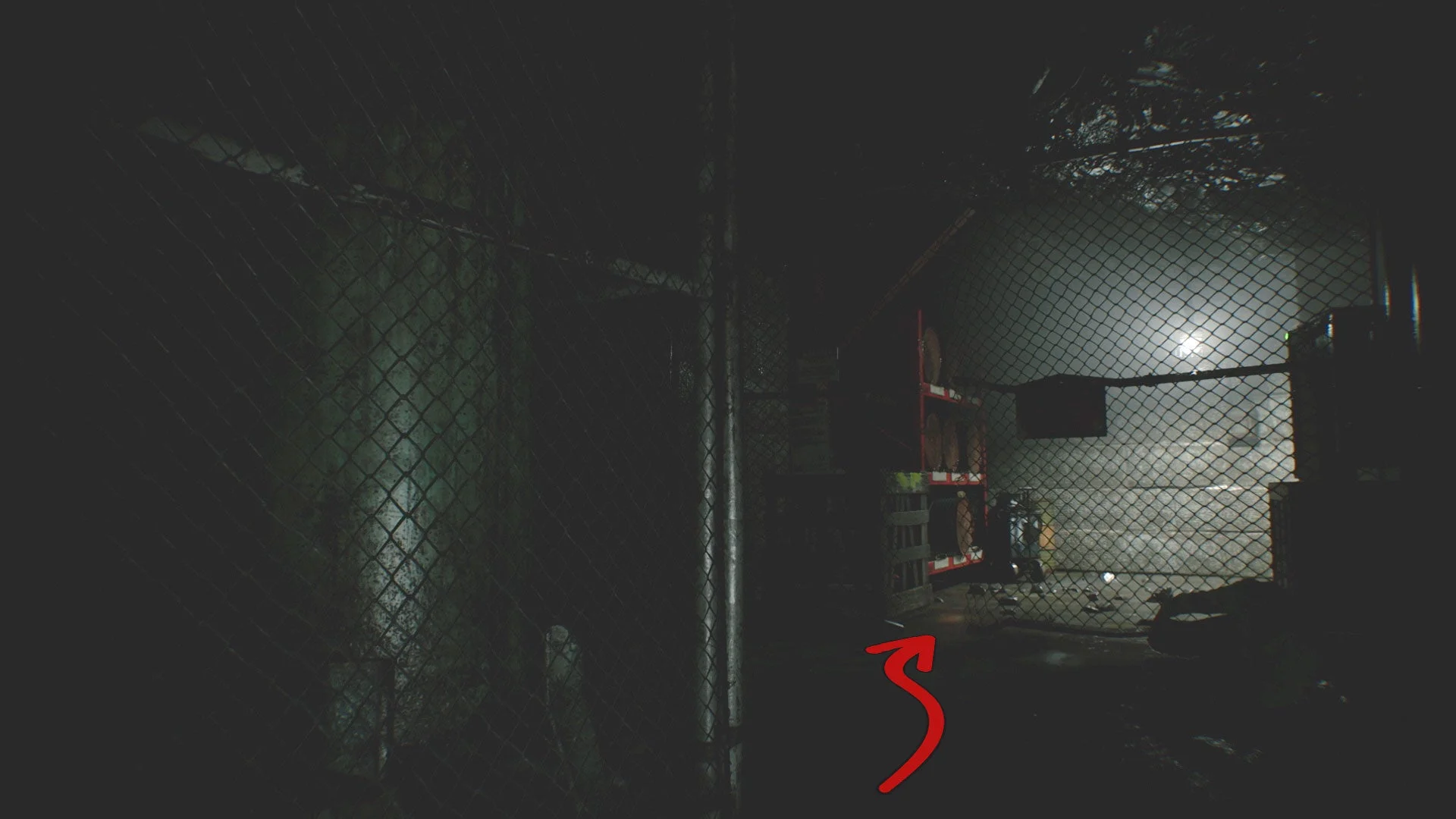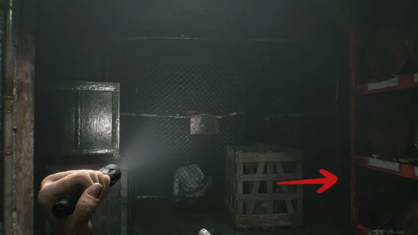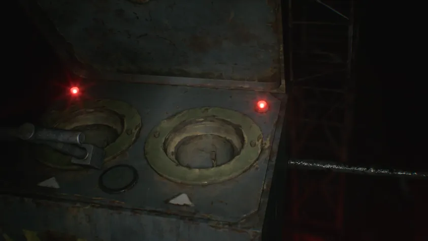 В дальней части основной комнаты, у открытой решётки есть лужа крови, большой стационарный погрузчик, для которого нужен ключ. Поскольку он сейчас блокирует дверной проём в комнату досмотра, пройти в неё пока нельзя, но вы можете достать из распределителя второй соединительный штекер. С пола подберите пустую бутылку. Только имейте в виду, что после этого комната погрузится во тьму.