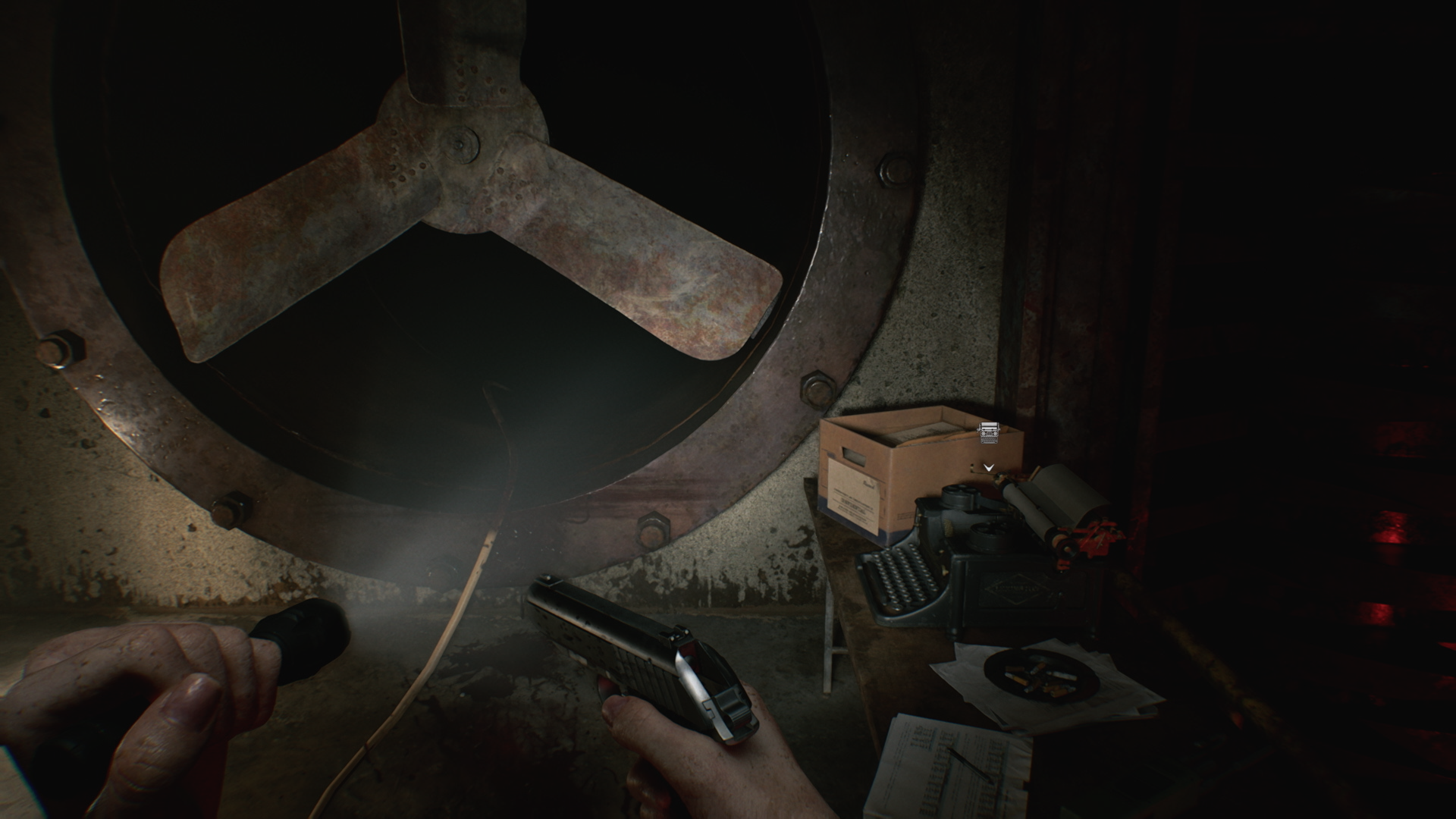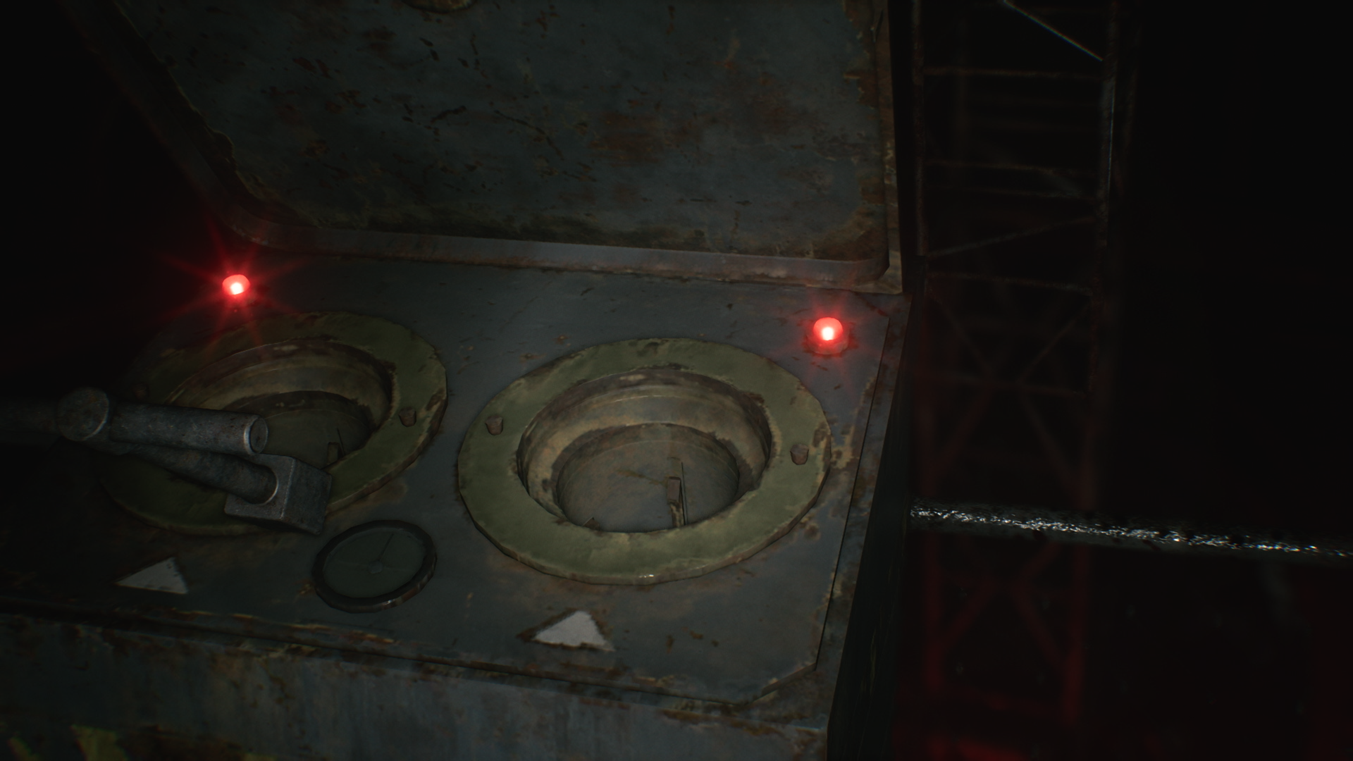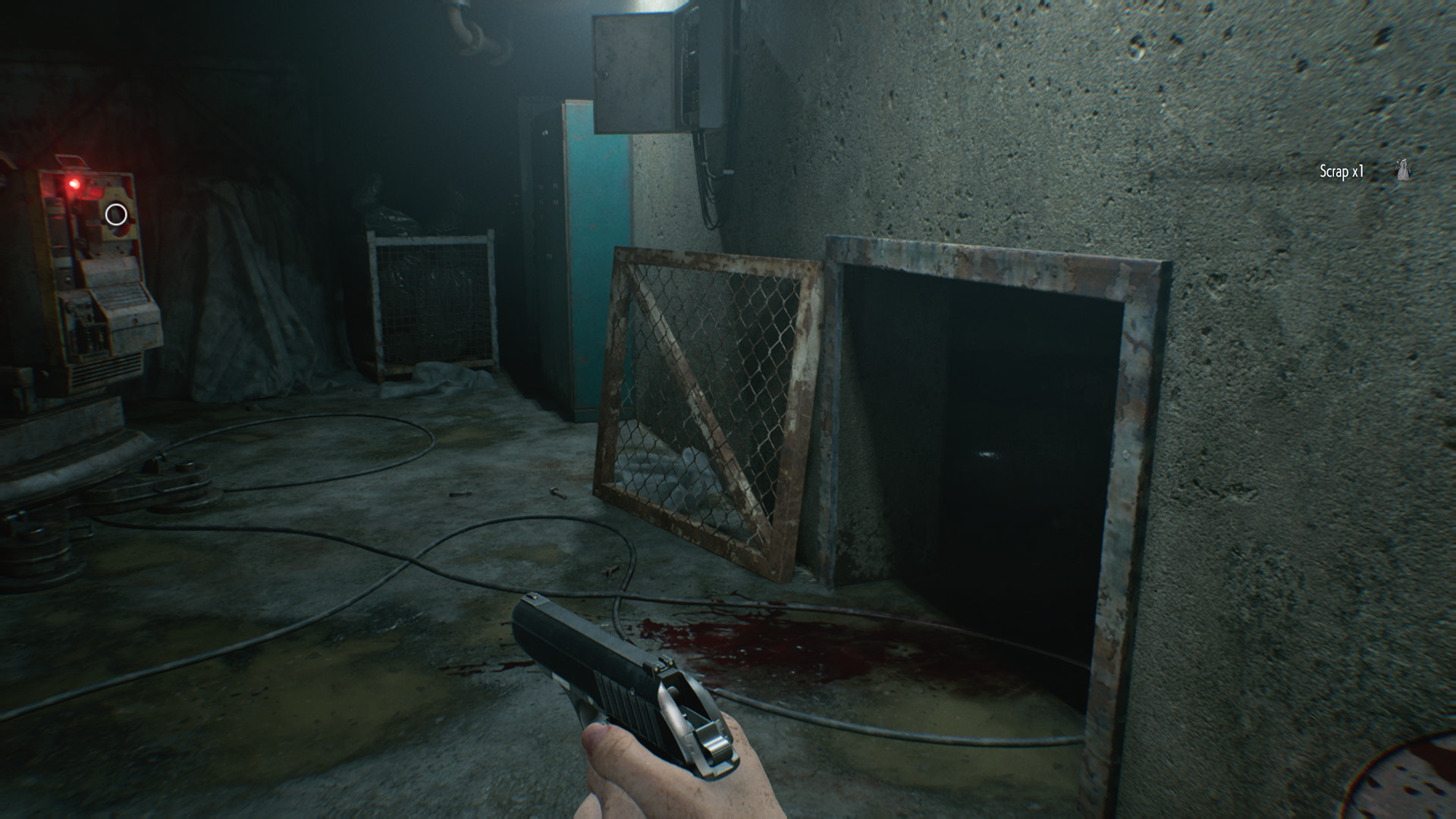 В дальней части основной комнаты, у открытой решётки есть лужа крови, большой стационарный погрузчик, для которого нужен ключ. Поскольку он сейчас блокирует дверной проём в комнату досмотра, пройти в неё пока нельзя, но вы можете достать из распределителя второй соединительный штекер. С пола подберите пустую бутылку. Только имейте в виду, что после этого комната погрузится во тьму.