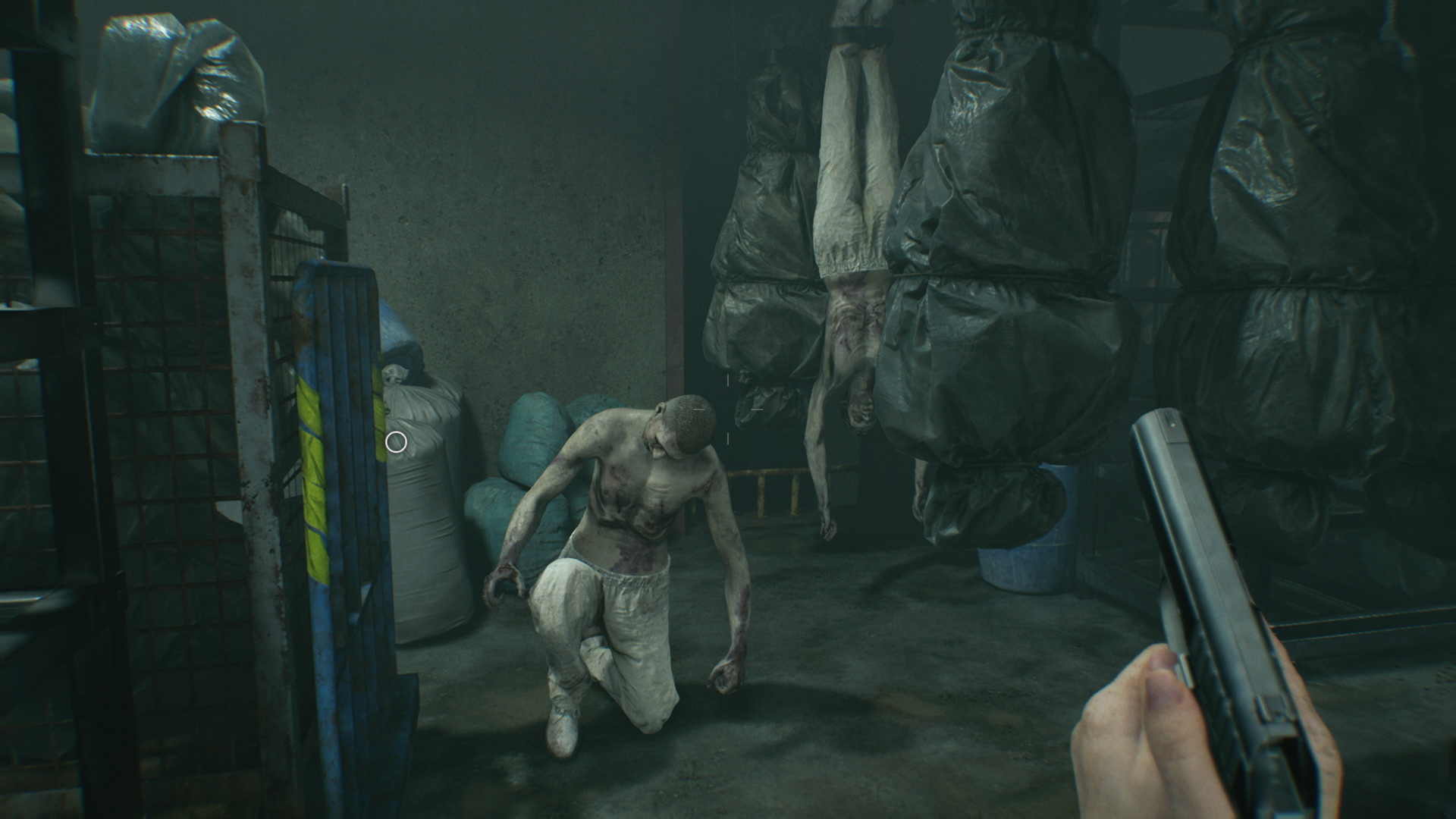 К счастью, это осветит помещение и заставит Девочку уйти. Теперь вы сможете ещё раз использовать ключ от погрузчика, чтобы открыть дверь и войти в комнату досмотра. Внутри этого большого помещения вы обнаружите огромный подвесной конвейер, на котором перемещают мешки с трупами, и несколько заражённых. Как только войдёте внутрь, устройство автоматически запустится. Бесконечный поток тел будет перемещаться слева направо.