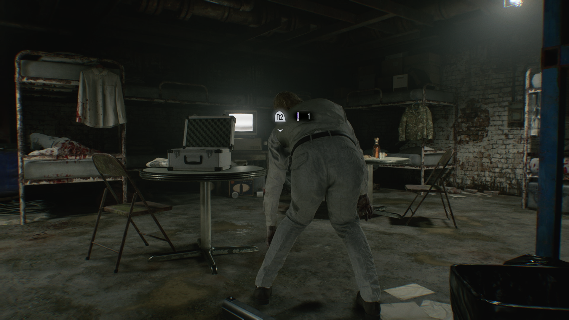 Вместо этого проверьте спальное помещение на противоположной стороне, где есть парочка заражённых. Убив обоих, осмотрите открытый ящик в центре помещения, чтобы найти рецепт коктейля Молотова. Его можно сделать из пустых бутылок и крови. Пока находитесь в спальном помещении, обязательно посмотрите на мерцающий телевизор — на нём стоит фигурка Мистера Енота. На койке слева ищите патроны для пистолета, а возле трупа — лужу крови. Наконец, проверьте дальний конец комнаты, где находятся шкафчики. В одном лежат обломки, а другой заперт, и вы можете использовать найденную ранее отмычку, чтобы получить ещё один редкий металл для изготовления патрона «Реквием»!