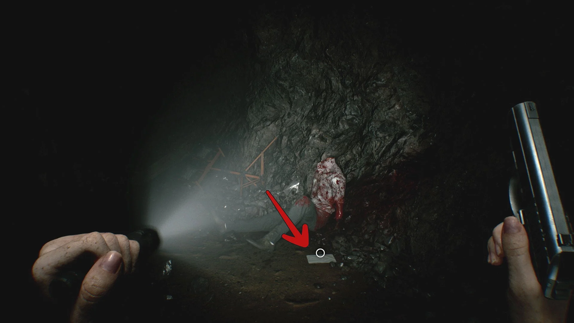 Достаньте фонарик и осмотрите странный пещерный туннель, напоминающий темницу. Неподалёку ищите обезглавленный труп, рядом с которым лежит документ «Последние слова сотрудника» (документ 37/75).