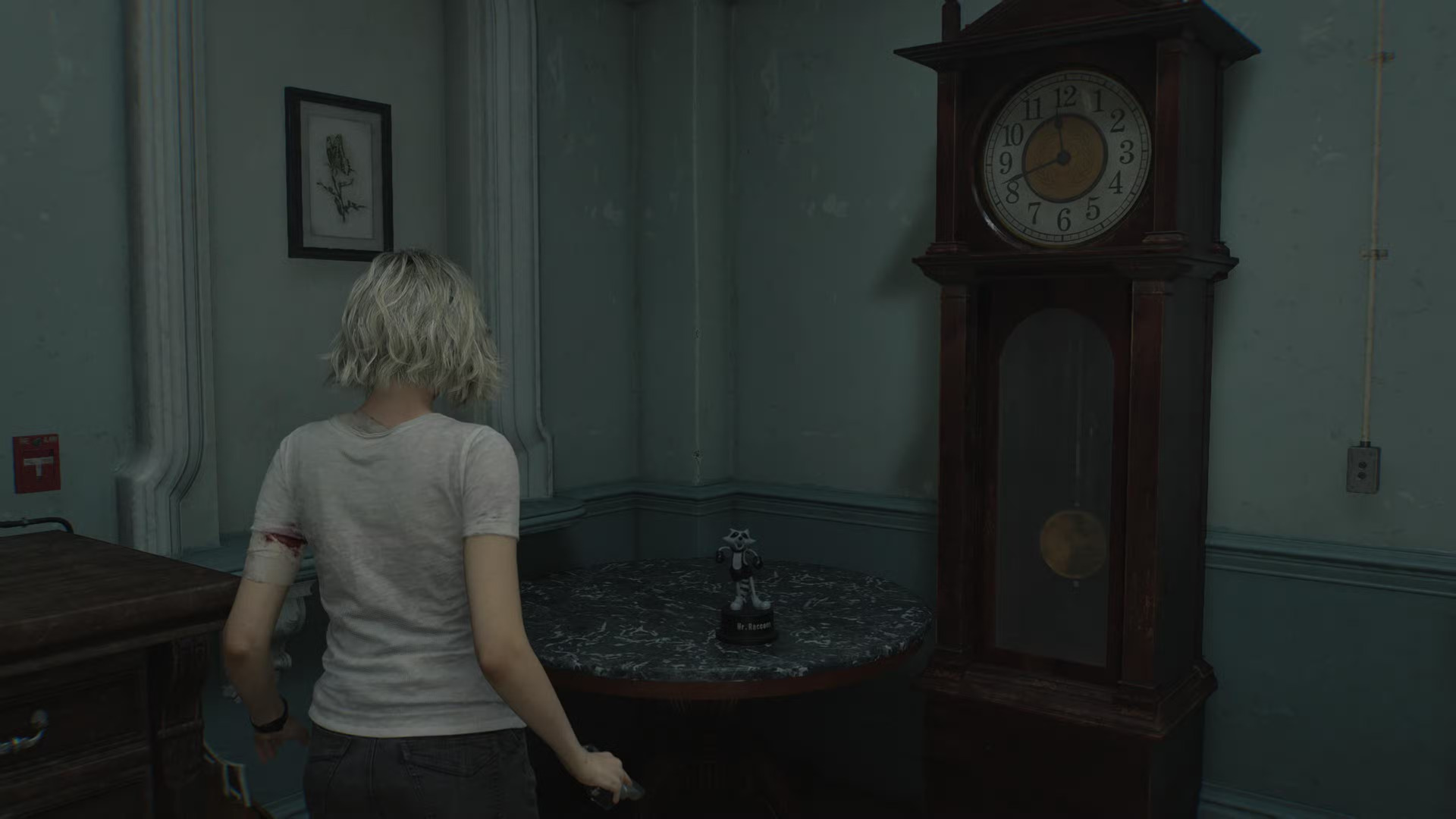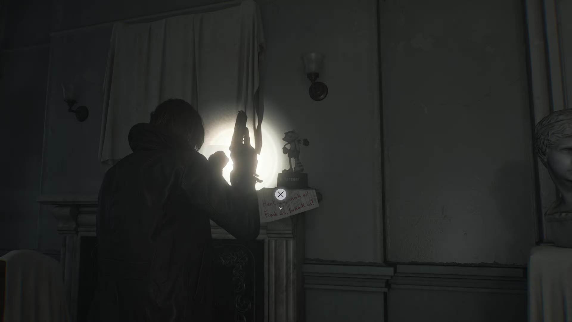 Играя за Леона, вы встретите первую фигурку вскоре после выхода из реабилитационного отделения во время первого посещения больницы Роудс-Хилл. После использования бензопилы и побега из отделения пройдите через соседнюю комнату и двигайтесь дальше — впереди на каминной полке стоит Мистер Енот. Под статуэткой лежит записка с надписью: «Охотьтесь за нами, ищите нас, находите нас, ломайте нас».