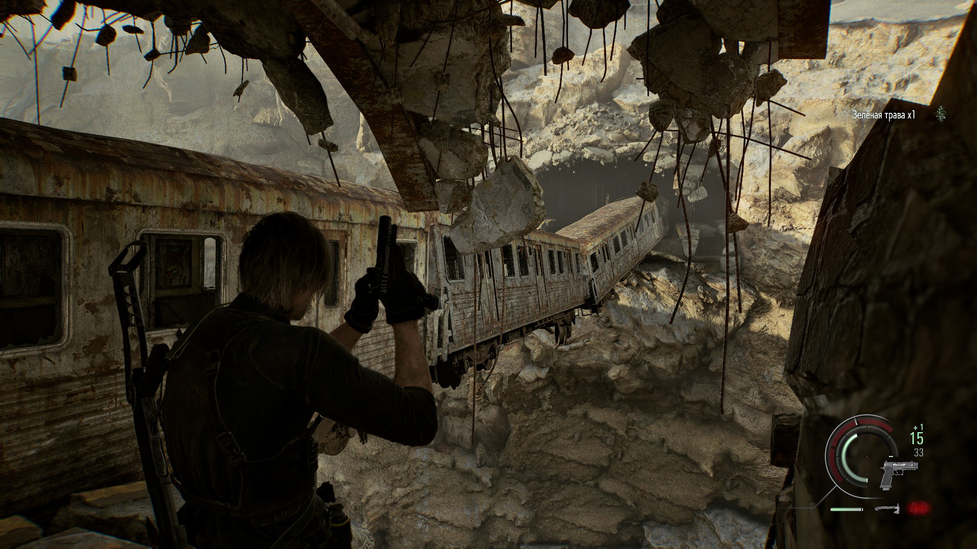 Что до Леона, то у него тоже есть свой крафт, но уже не из жидкости, а в духе старых Resident Evil — из пороха. У второго героя и арсенал оружия шире, и инвентарь гораздо больше, поэтому ему нет нужды его постоянно складывать лишнее в ящик (им может пользоваться только Грейс). Трекер на запястье начисляет Леону очки (опять-таки отсылка, но уже к более свежим частям франшизы), и затем, в перерывах между боями, в специальных контейнерах с припасами он может покупать новое оружие, улучшения для него и броню.
