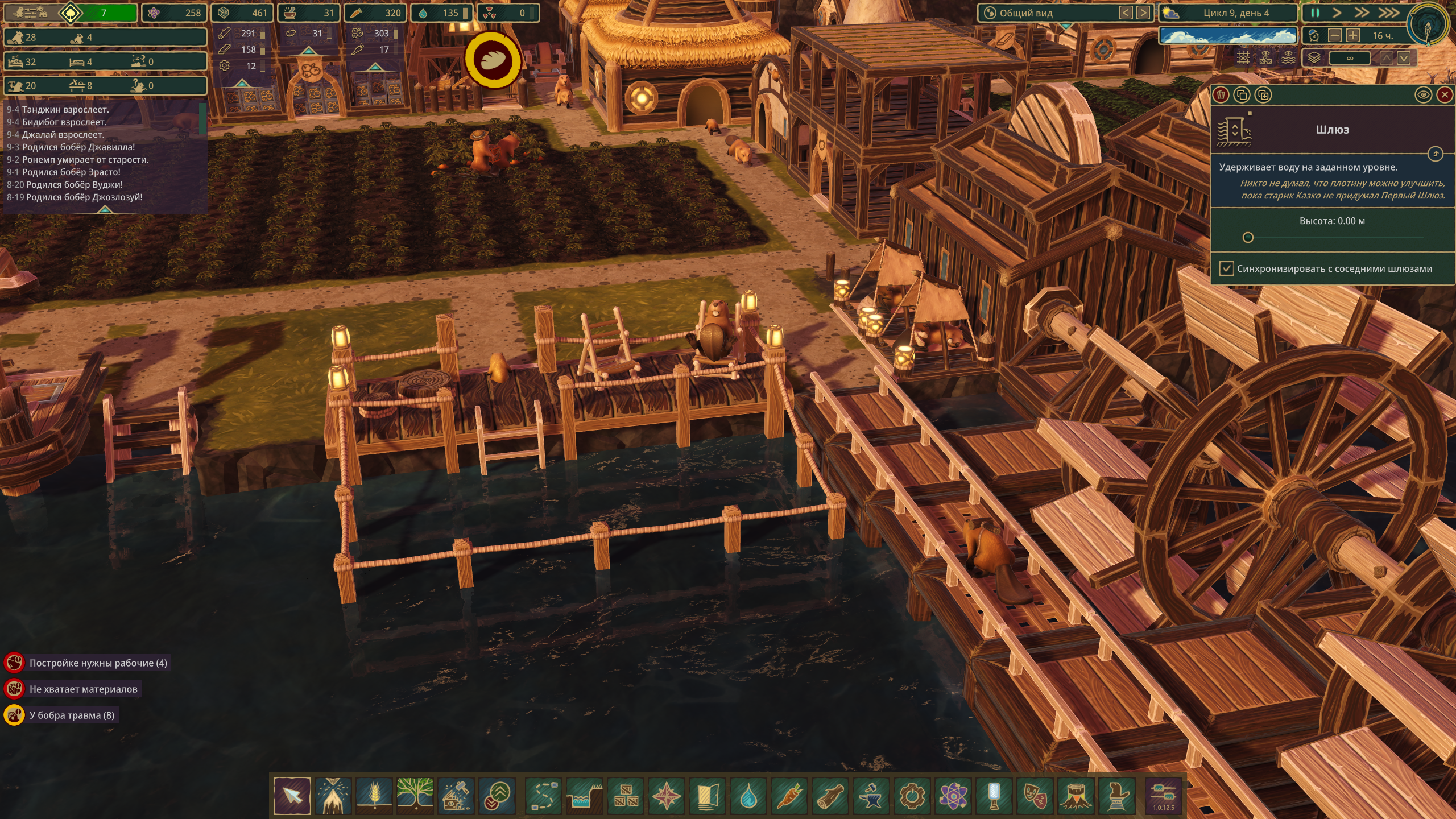Неудивительно, что главные беды ждут бобров, когда с драгоценной водой что-то случается, будь то засуха или заражённый прилив. Город перестаёт развиваться, производство встаёт на паузу, а безбедная жизнь превращается в выживание с подъеданием запасов. Чтобы этого не случилось, предстоит обратиться к древним технологиям бобров — строительству плотин и их более продвинутых родичей: дамб и заслонов.
