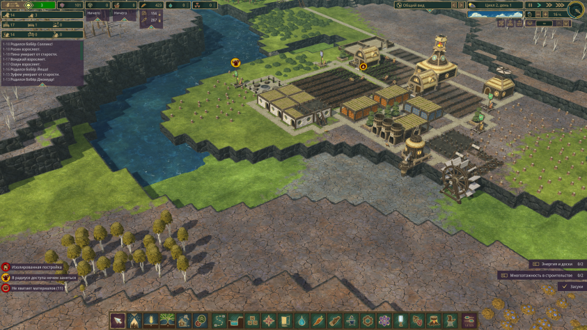 Несмотря на все предпринятые меры, первая же засуха остановит производство. В дальнейшем каждая такая непогода будет отнимать всё больше времени и приходить неожиданно и некстати. Долго стагнировать в деревеньке не получится — придётся раскрывать режим строительства в поисках решения. А там — ветряки, двигатели и батареи, сохраняющие энергию на чёрный день.