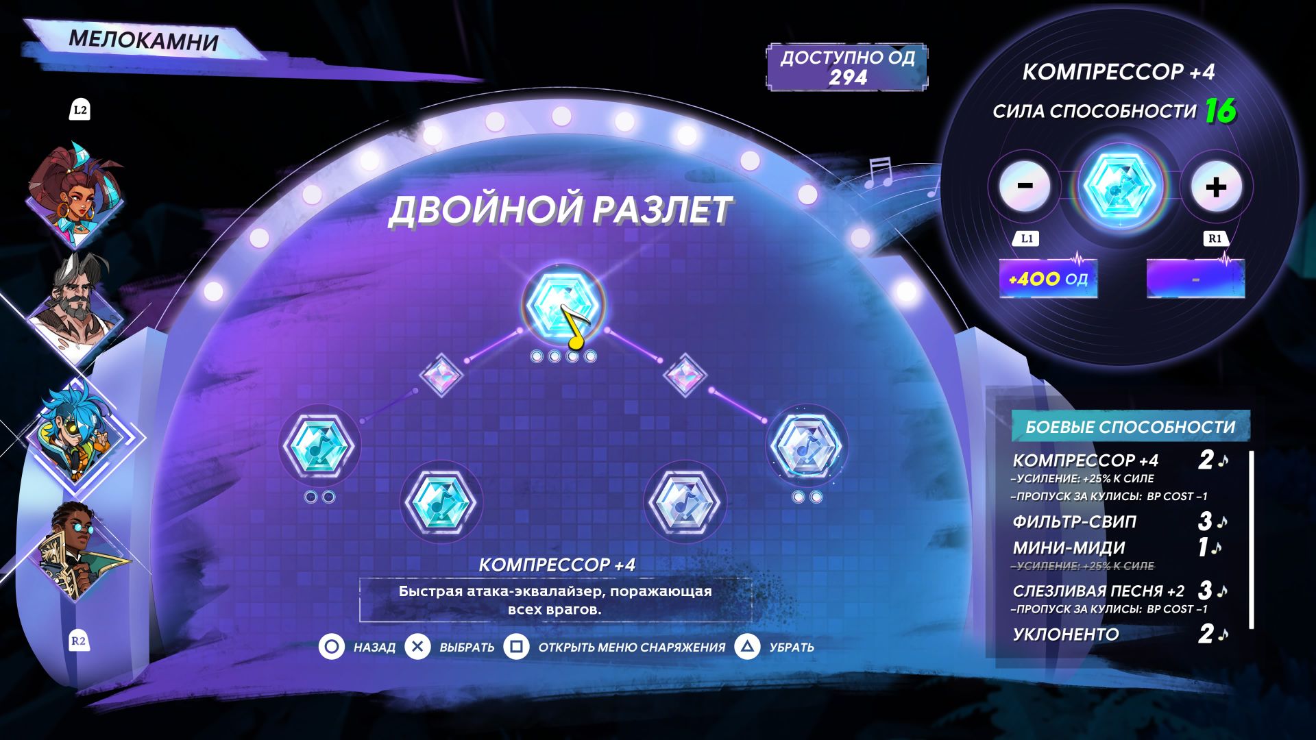 Самое интересное связано с инструментами. Чем выше их показатель атаки, тем больше в них слотов для мелокамней — они отвечают за доступные персонажу активные навыки. Но ещё важнее слоты для камней ремиксов, связанные лишь с некоторыми ячейками. Камни ремиксов — бонусы, модифицирующие мелокамни при выполнении определённых условий. Например, сильную атаку можно связать с камнем, который эту атаку делает на 50 % мощнее, если при её использовании истощается шкала очков бита. Или есть камень, усиливающий приём на 40 %, если тот последний в строфе, — то есть этот персонаж должен завершать ход после всех остальных.