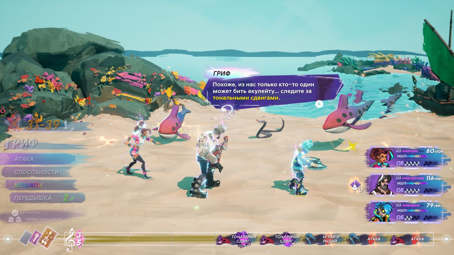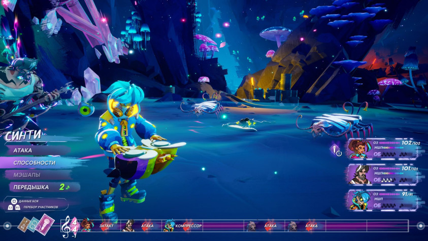 Сражения же проходят в пошаговом формате, и оформлено всё по-музыкальному. Ходы называются строфами, в нижней части экрана показан тактовый размер с уточнением, сколько действий может совершить ваша команда и какие приёмы используют оппоненты. В подавляющем большинстве случаев первым ходит игрок, и чаще всего каждый участник в отряде может что-то сделать, прежде чем начнётся ход противника. Можно либо атаковать, либо отдохнуть и повысить защиту, либо применить способность, используя очки бита — местный аналог маны, который немного восстанавливается в начале хода.