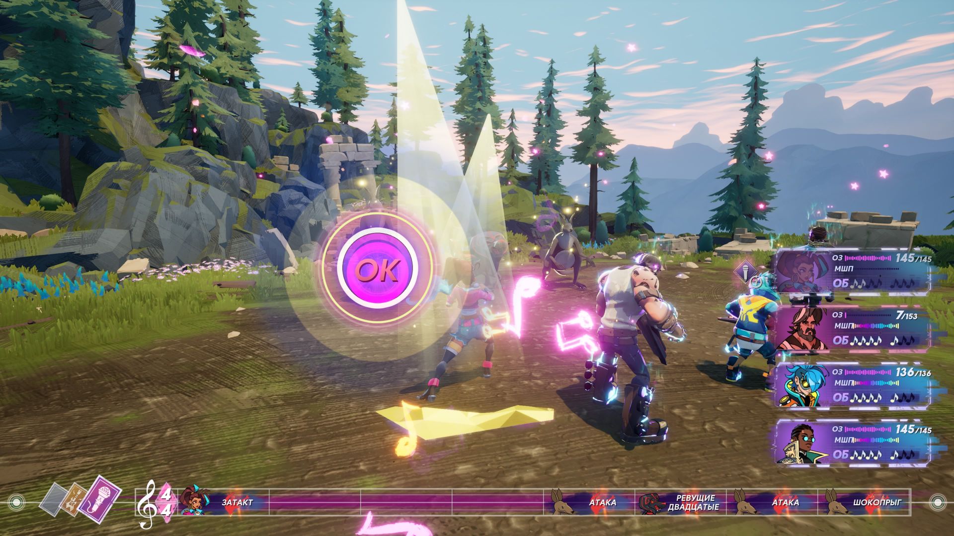 Проблема в том, что эти QTE абсолютно одинаковые. Можно вспомнить Clair Obscur с похожей механикой, где тоже всё по большей части ограничивалось нажатием вовремя на X, но там и игра не про музыку. Каденция восстанавливает здоровье союзнику — нажимаешь три раза. Рокер Гриф использует «Хедбэнг» и бьёт гитарой — нажимаешь два раза. Диджей Синти выпускает из своего пульта диски — нажимаешь один раз. Никаких прикольных комбо, никаких удерживаний кнопок, как в некоторых музыкальных аркадах, — просто нажатия, которые к концу игры становятся рутиной. Из-за этого уникальные персонажи из разных миров слишком похожи друг на друга — даже в недавней Escape from Ever After, которая вообще не про музыку, механика была реализована интереснее.
