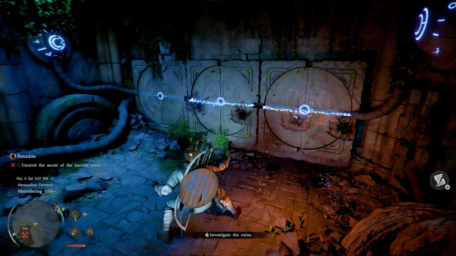 Этот навык позволяет восстанавливать запас духа, необходимого для использования способностей зелёной ветки, включая «Удар пальмары». Теперь вам предстоит активировать три каменных диска, вдавив их в стену. Продолжайте воздействовать на них до полного срабатывания. Если энергия закончится, удерживайте X для её восстановления.