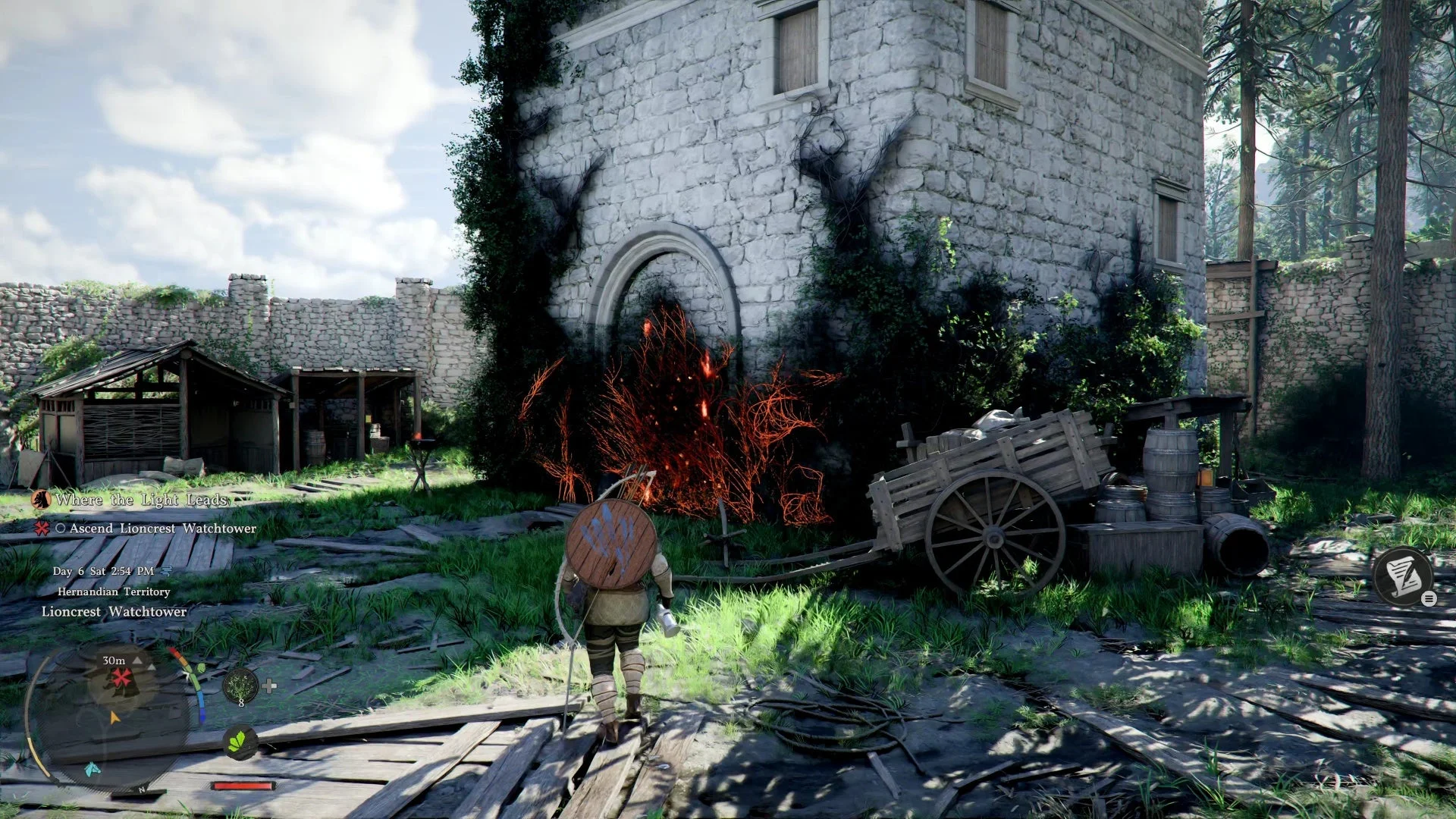 После зачистки вам предложат подняться наверх. Для этого потребуется лук: зажмите Q, чтобы его достать, затем подойдите к любой жаровне с огнём. Подожгите стрелу и выстрелите в лиану, преграждающую вход.