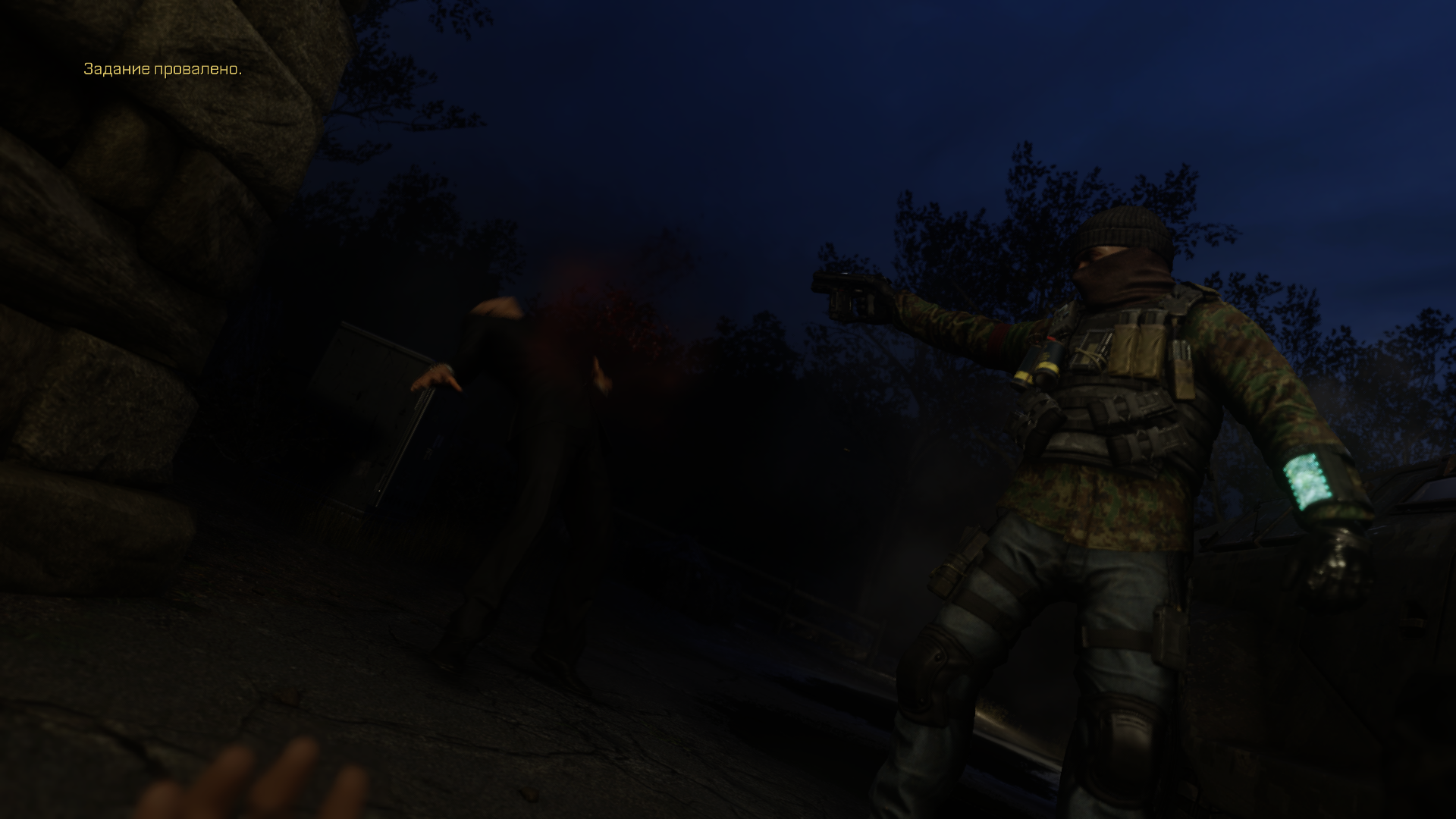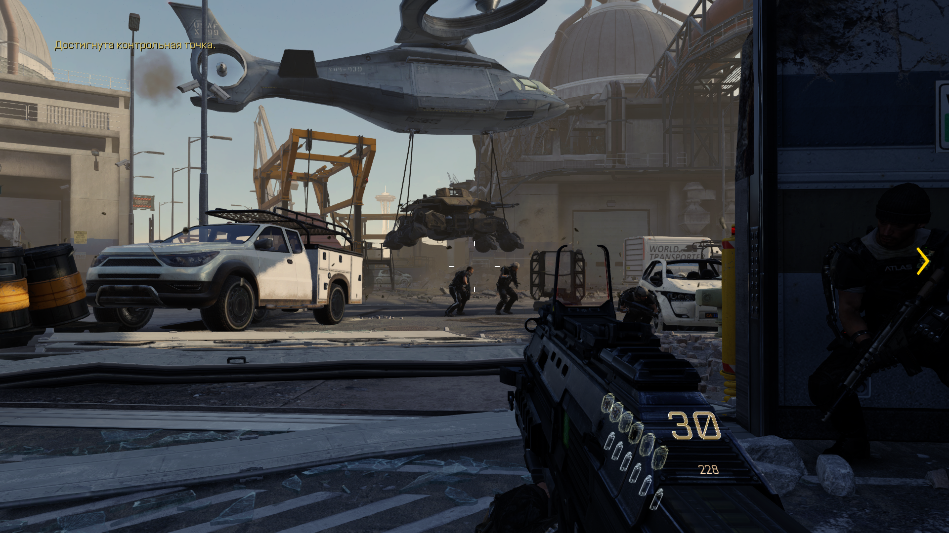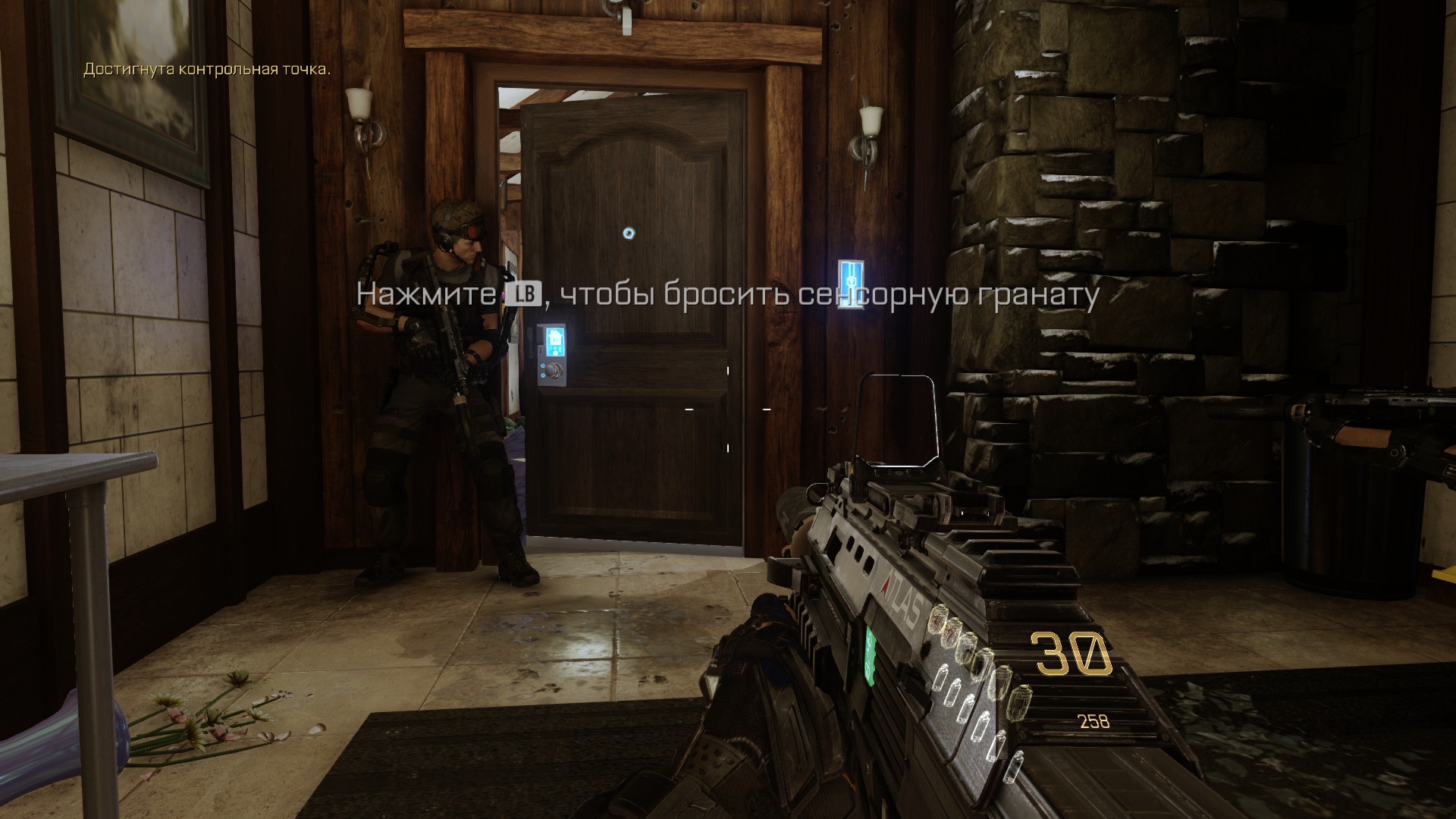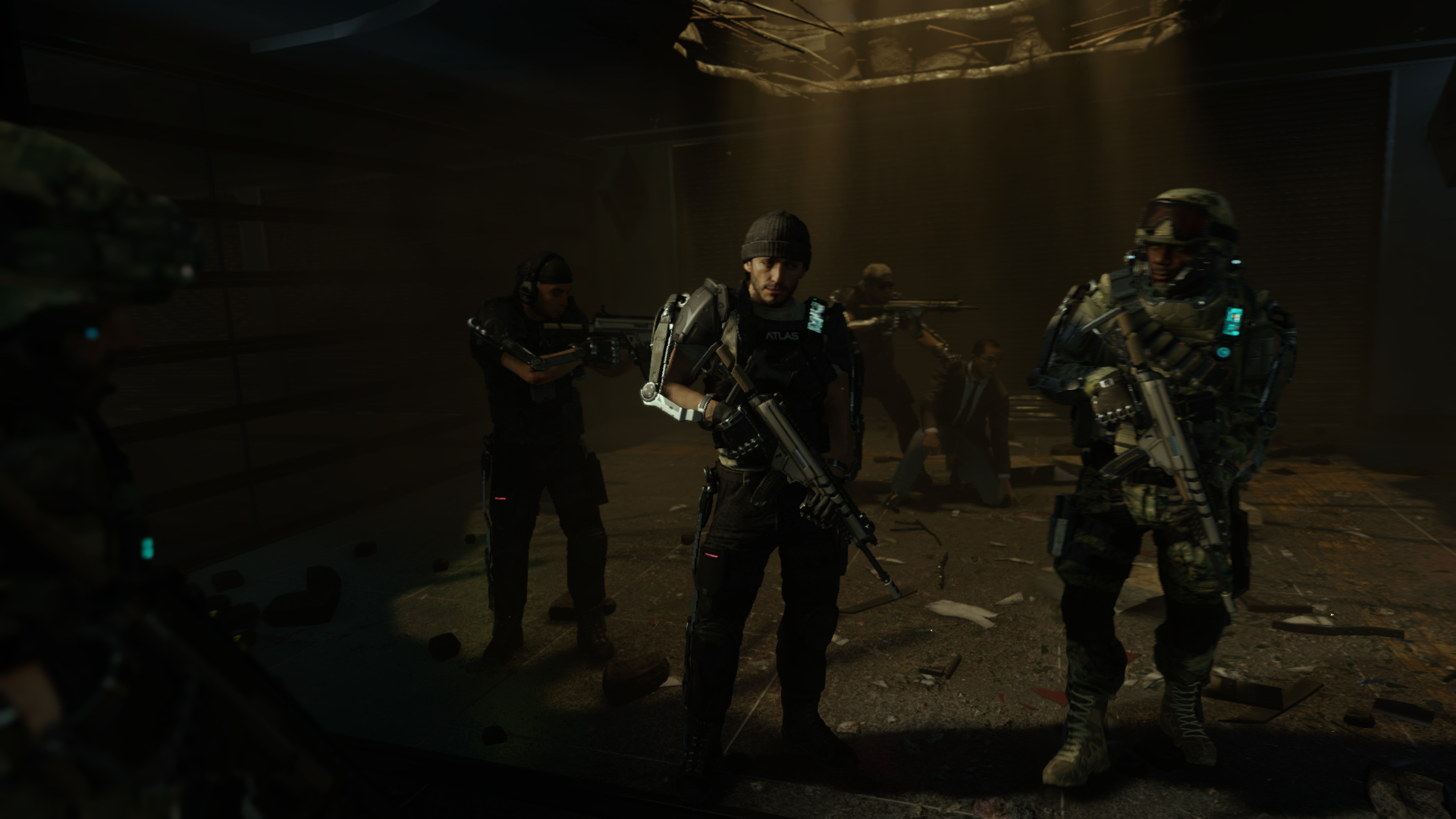 С похорон товарища (тот самый меметичный press F to pay respects) есть шикарный переход на первое задание. Когда мы держим визитку Атласа, гремит гром и вот мы уже на задании по освобожению заложников.