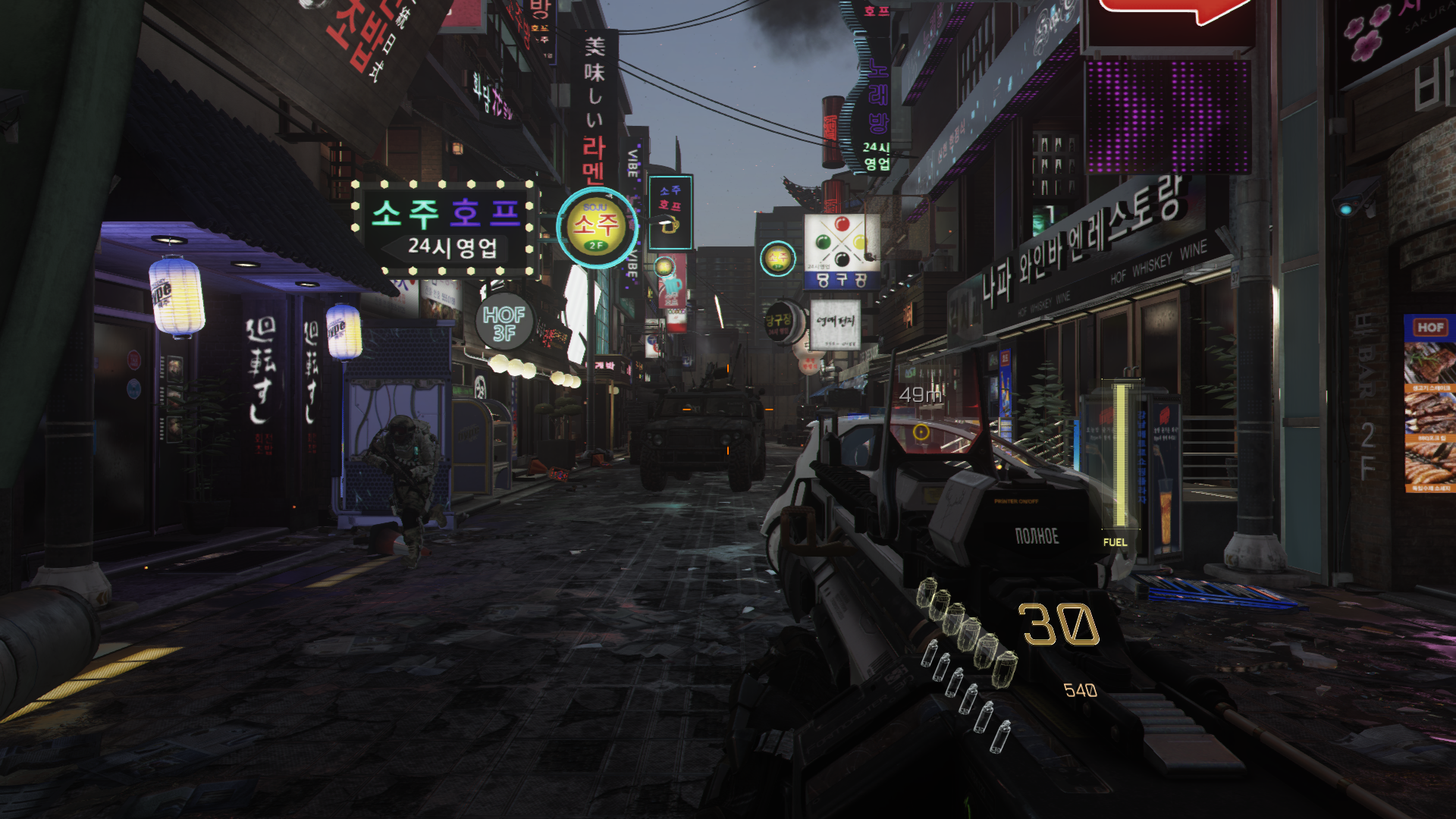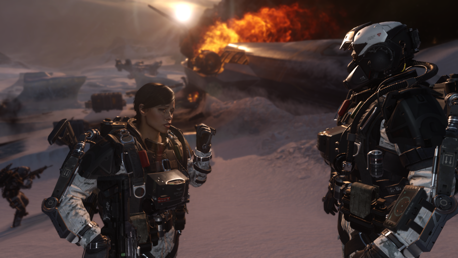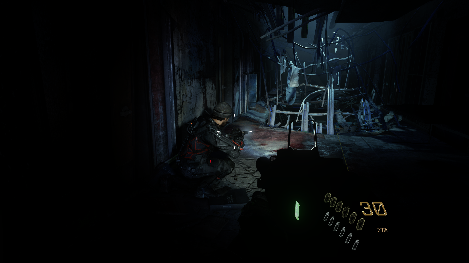 На уровень дается один из нескольких экзоскелетов с набором из трех умений: оглушение ближайших противников, джетпак с двойным прыжком, замедление времени, крюк-кошка, полицейский щит, магнитные перчатки для лазания по стенам, и в одной из миссий будет невидимость. Также в конце уровня прокачиваем кол-во гранат, скорость перезарядки, восстановление способностей. Еще здесь многофункциональные гранаты: осколочная может и технику (дроны, например) глушить, а ослепляющая противников подсвечивать (узаконенный волхак!).