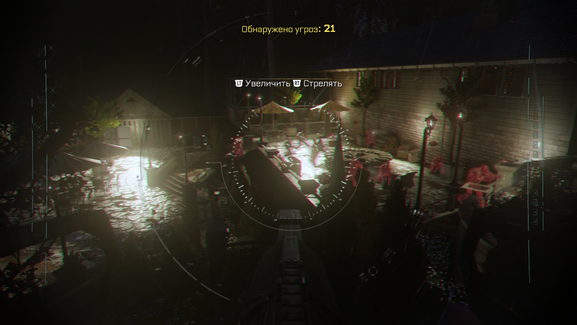 В другом задании скачем по крышам поместья главгада с крюком-кошкой и прячемся в кустах.
